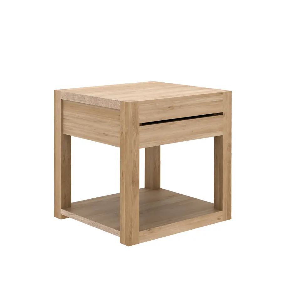 Esta robusta mesita fabricada en madera maciza de roble es bonita y funcional. Cuenta con un cajón en la parte superior y una base de madera en la parte inferior que puede usarse también para colocar objetos.