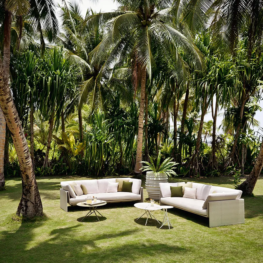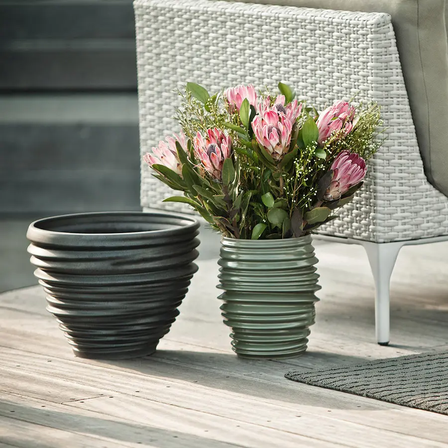 La emblemática colección de cubretiestos, jarrones de jardín y taburetes BABYLON, creada por el famoso dúo de diseñadores Harry & Camila, constituye una aportación primordial a la concepción que DEDON tiene del Salón de Exteriores. Estas sorprendentes piezas, reconocibles por sus formas estriadas, asimétricas y aparentemente inestables, pueden dar la impresión ser obras de artesanía únicas.