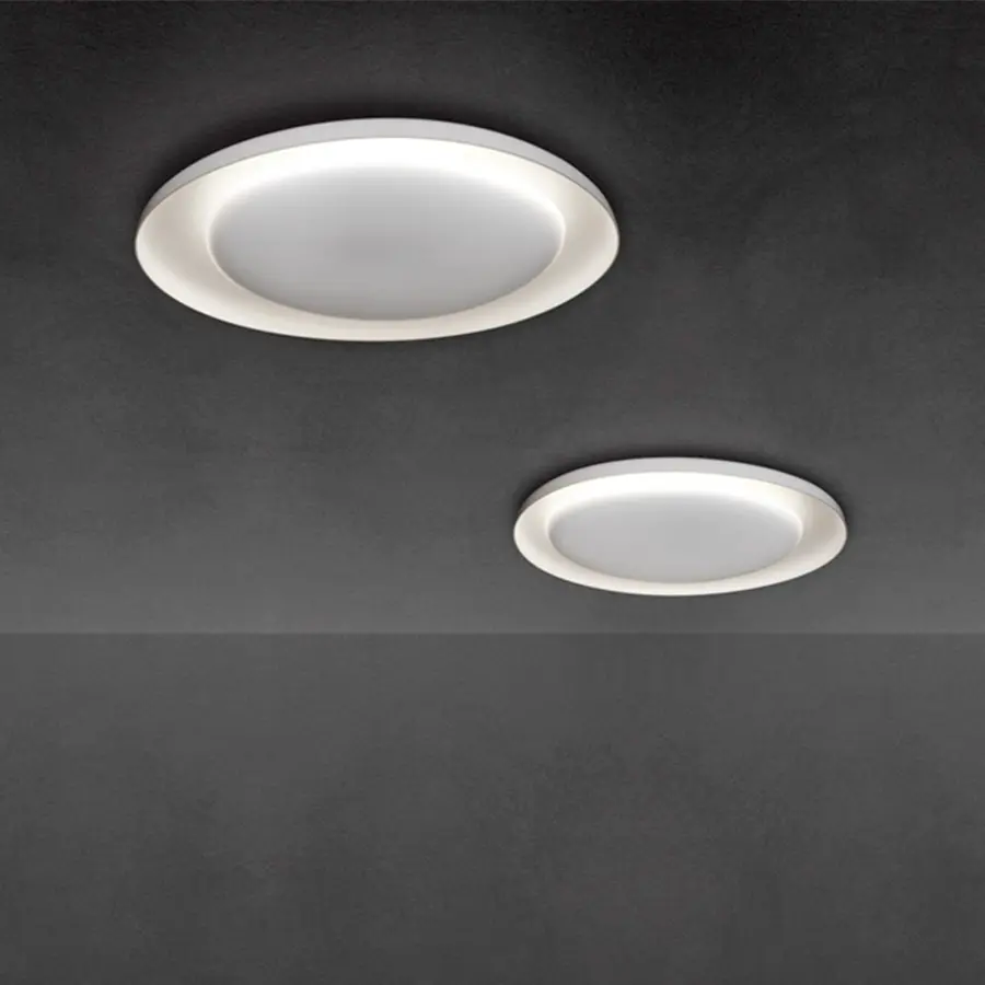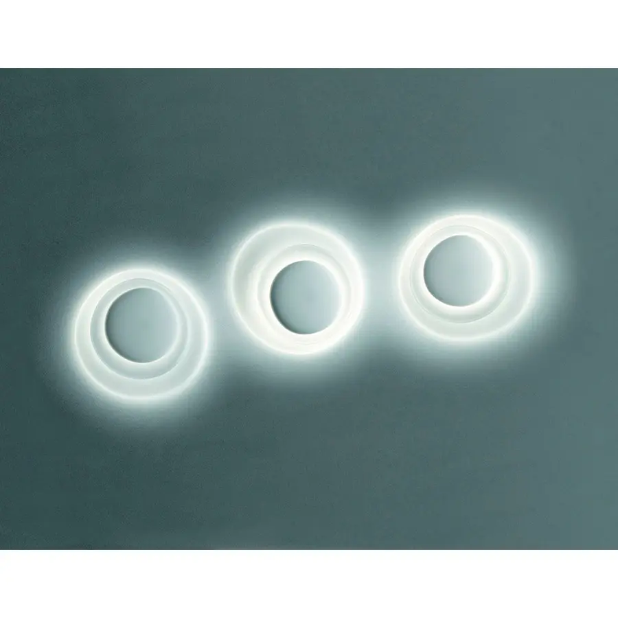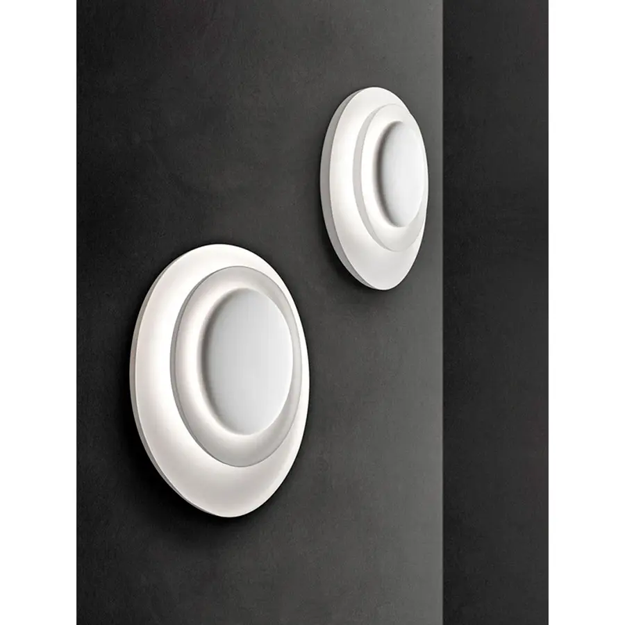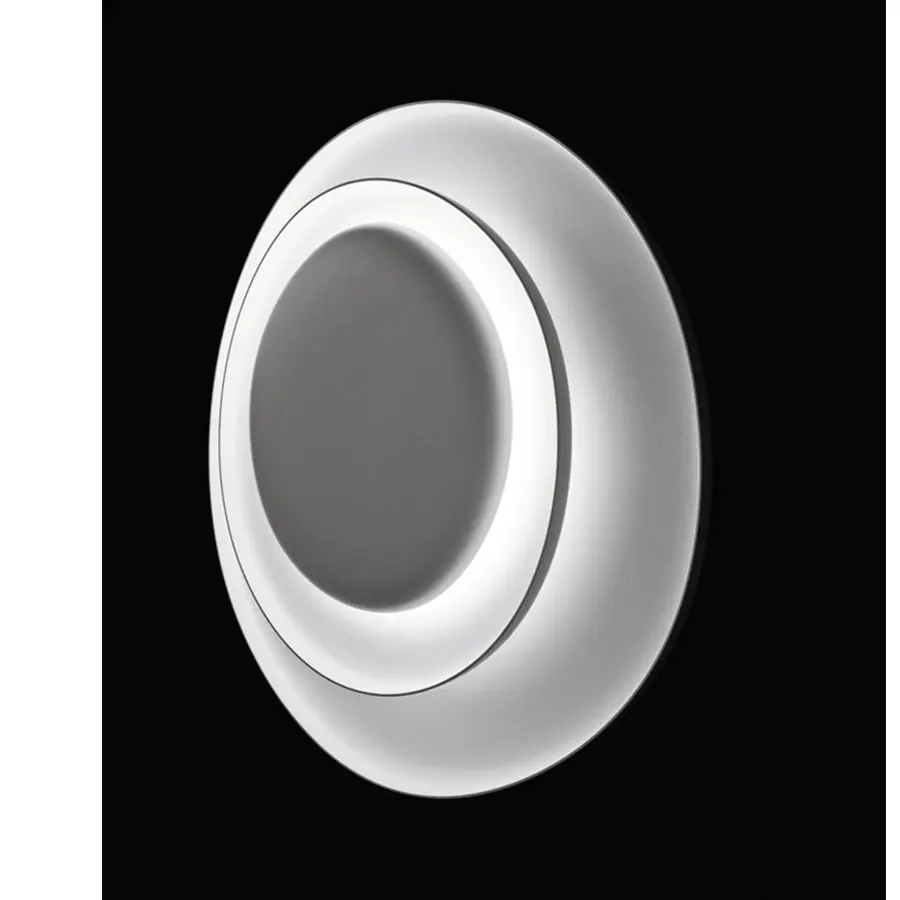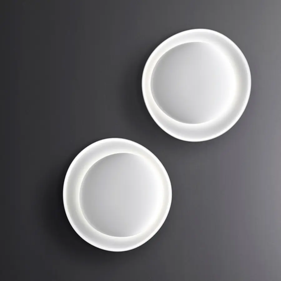 Bahía es una lámpara de pared y de techo queseduce y atrae, gracias a la particularidad de su dibujo y al inédito juego de luces y sombras que se produce. Su encanto emerge de la sobreposición de tres platos, imperceptiblemente asimétricos en el perfil y en la disposición recíproca. Los dos primeros albergan la fuente luminosa, acompañando y abrazando la luz que discurre sobre su superficie cóncava, esfumándose hacia los bordes. El tercer elemento completa la composición, recortándose en contraluz de forma decidida y contrastante. Cada resplandor que emana Bahía se encuentra comprendido en un resplandor más extendido y difuso, una mágica composición de claros y oscuros, que la convierten al mismo tiempo en un objeto iluminante y en una luminosa decoración. Bahía se propone en una única tonalidad absoluta, el blanco, para destacar su escenográfica esencialidad, su ser sin aparecer. Bahía es capaz de resolver por sí sola la decoración de toda una pared, con un grosor reducido, o crear composiciones múltiples, archipiélagos luminosos en el espacio doméstico o colectivo.