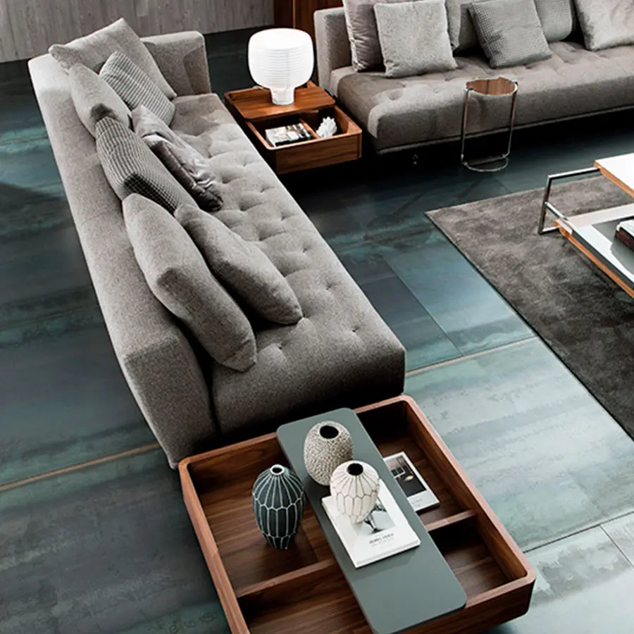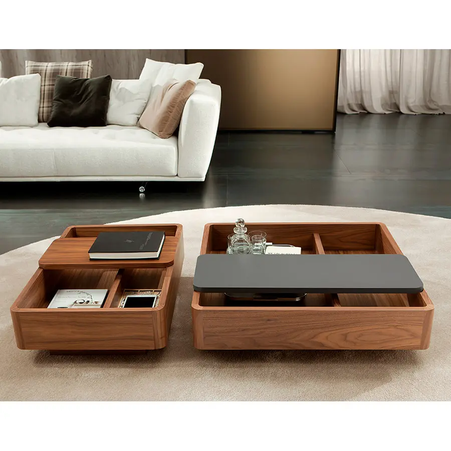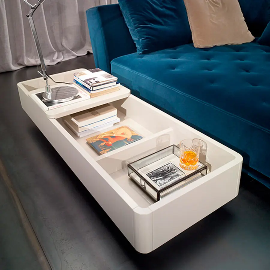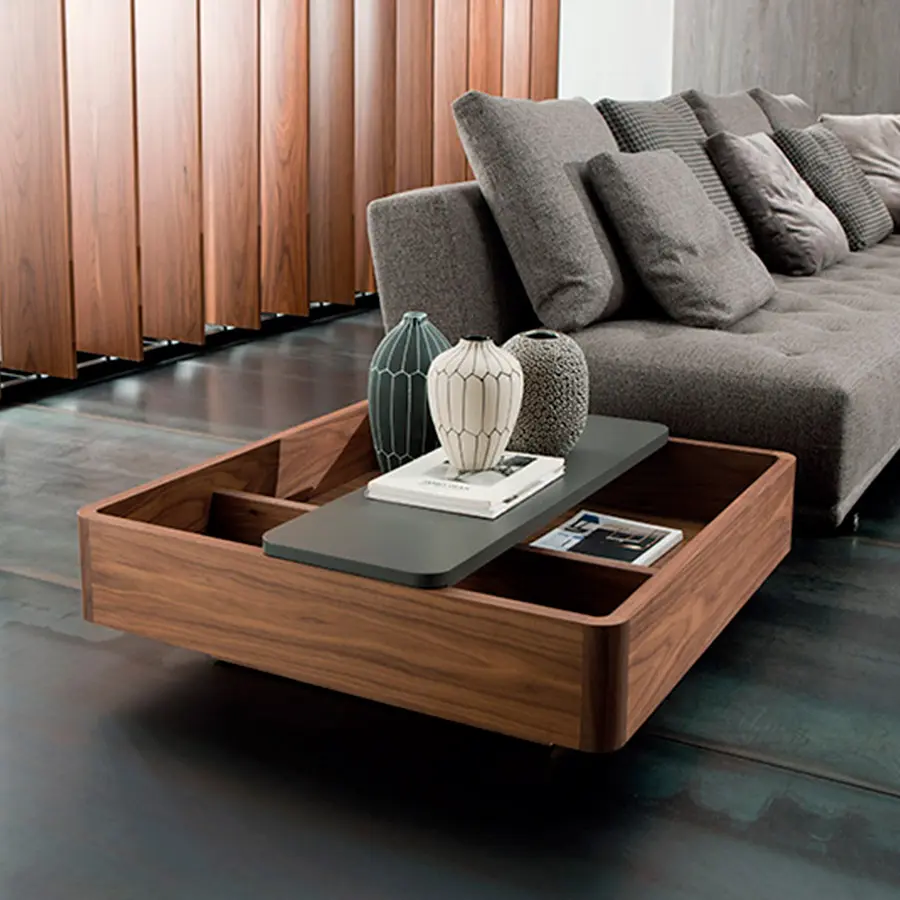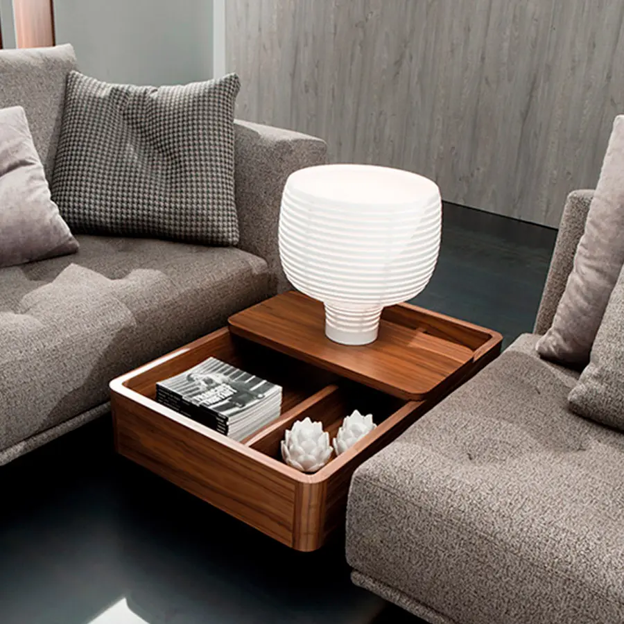 La idea de los contenedores Baku parte de la posibilidad de tener un elemento que cumpla las funciones de la mesa lateral tradicional pero con la capacidad además de almacenaje. Dichos elementos pueden ser colocados no sólo en la zona terminal de los sofás (tradicional) sino que también entre dos piezas de los sofás, creando así una nueva disposición de los deslizable, que permite ajustar el mueble a la necesidad del momento. Realizados en madera permiten la mezcla de acabados entre el contenedor y el sobre deslizante.