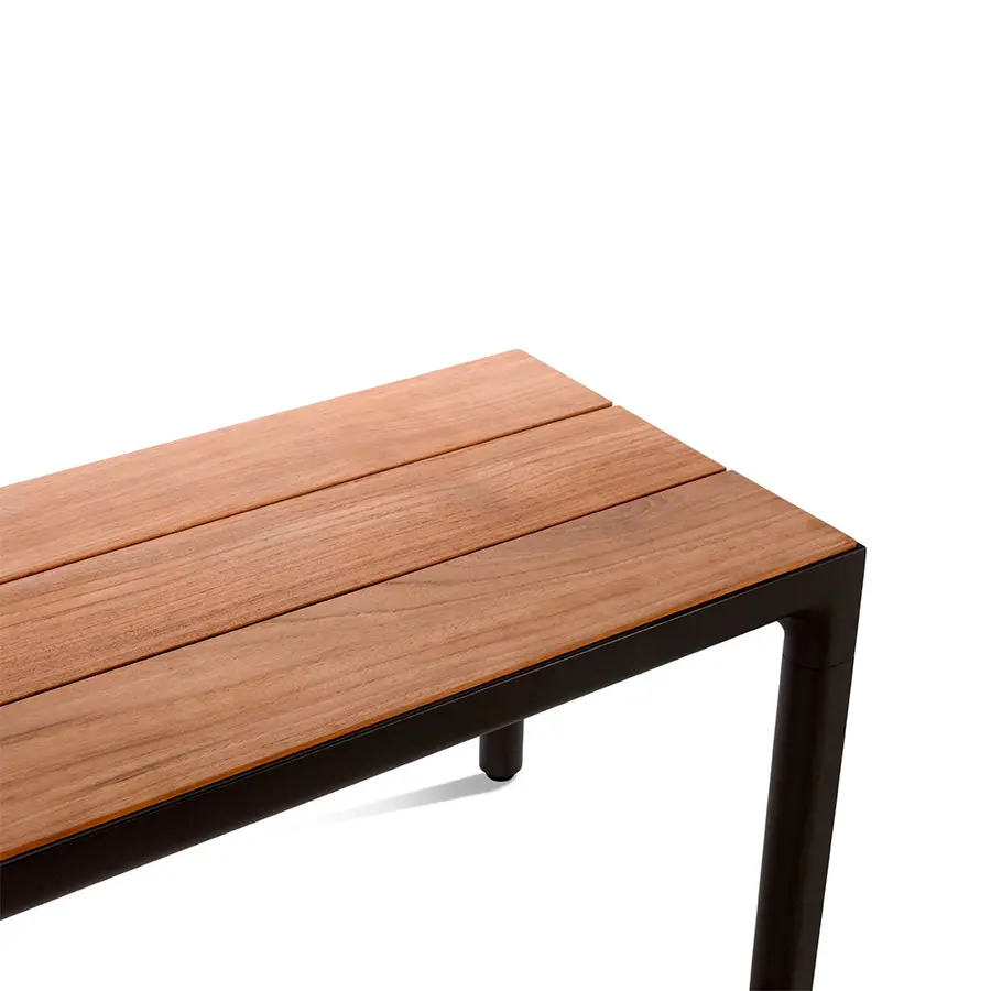 El banco, gracias a sus delgadas patas y sus preciosos perfiles redondeados, es puro y simple. El marco de aluminio es fácil de mantener. Per el asiento de teca, Tribù solo utiliza la mejor teca que se puede encontrar en Java: una madera de primera clase con un grano recto procedente de plantaciones gestionadas de forma sostenible.