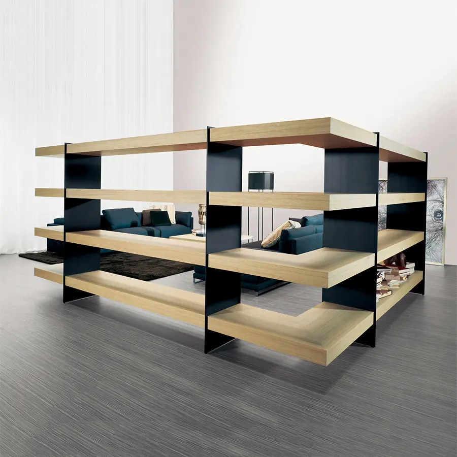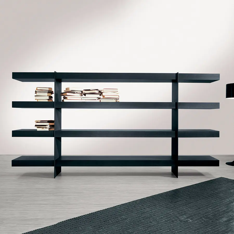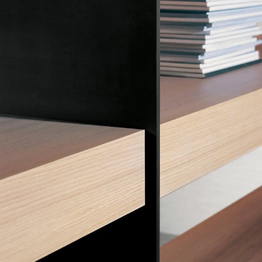 Estructura de estantes realizada en madera en color natural o vengué. También realizable en lacado blanco mate. Estructura de montantes realizada en aluminio macizo de 10 mm de espesor anodizado en color negro o natural. Subestructura interna realizada en aero tubular con acabado pintado epoxide.