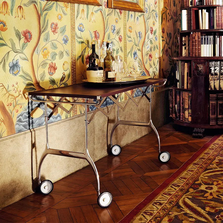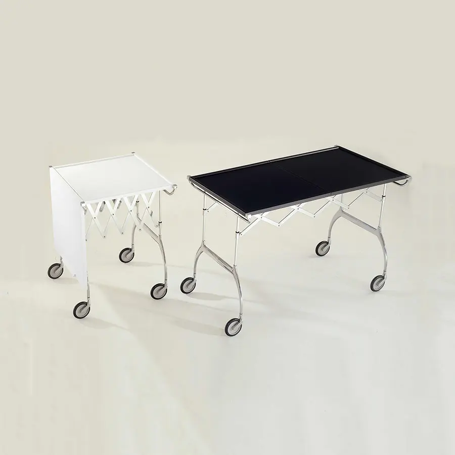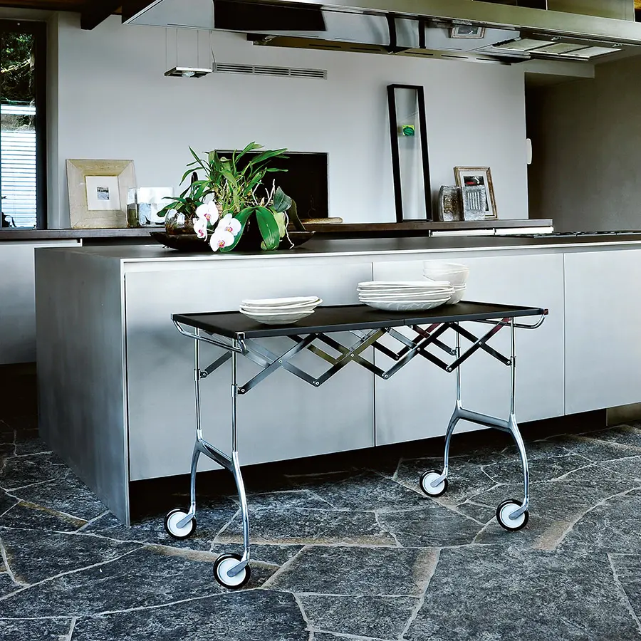 Además de ser un práctico carro con una sorprendente combinación de componentes de plástico y metal, Battista es una mesa extensible y plegable, ideal para buffets y aperitivos o como una pequeña mesa individual. Está disponible en la mayoría de los colores: blanco, negro, azul, ciruela o crema y en la elegante versión de poliéster de blanco lacado brillante.