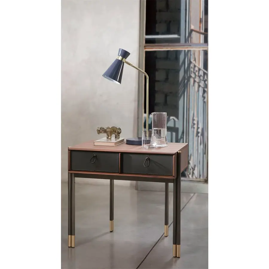 Mesa de noche de nogal canaletta con dos huecos (es posible poner máximo dos cajones Bayus). Bordes de la tapa y divisorios en nogal canaletta macizo. Base en metal bronzoro con puntales en latón cepillado.