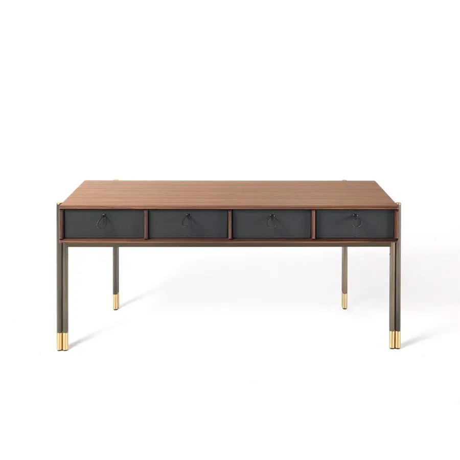 Mesa de noche de nogal canaletta con cuatro huecos (es posible poner máximo cuatro cajones Bayus). Bordes de la tapa y divisorios en nogal canaletta macizo. Base en metal bronzoro con puntales en latón cepillado.