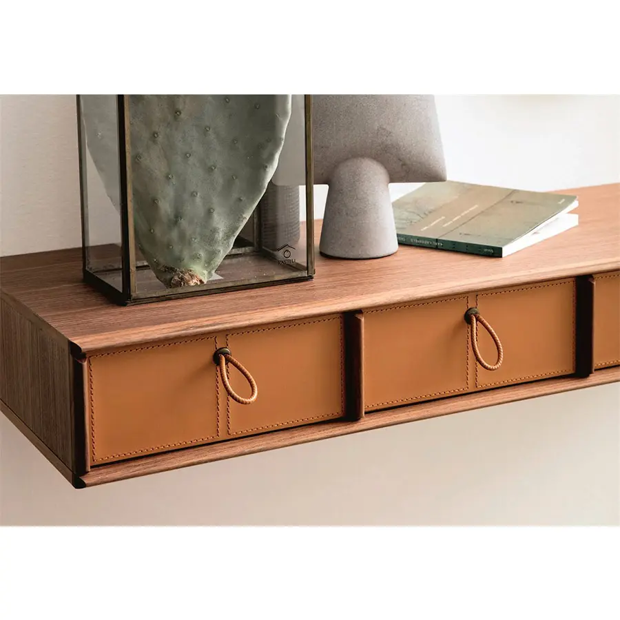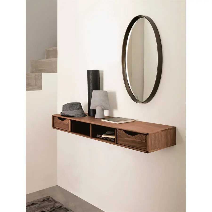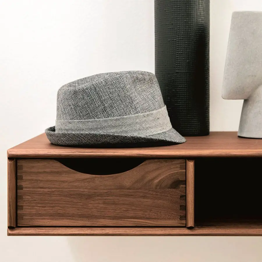 Estante en nogal canaletta con cuatro compartimentos (posibilidad de insertar hasta cuatro cajones BAYUS 5-6). Bordes macizos.