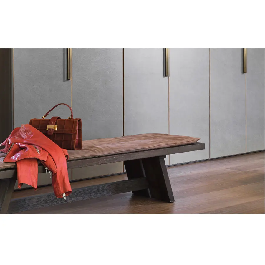La forma esencial de este banco encarna la esencia de un proyecto sofisticado. Perfecto en cuanto a medidas, caracterizado por un gran rigor estilístico, exaltado por el empleo de la madera. Su colocación ideal es a los pies de la cama, pero también se puede utilizar como elemento singular en cualquier otro ambiente de la casa. Se puede completar con un cojín de tejido o piel desenfundables, realizado en una única pieza.