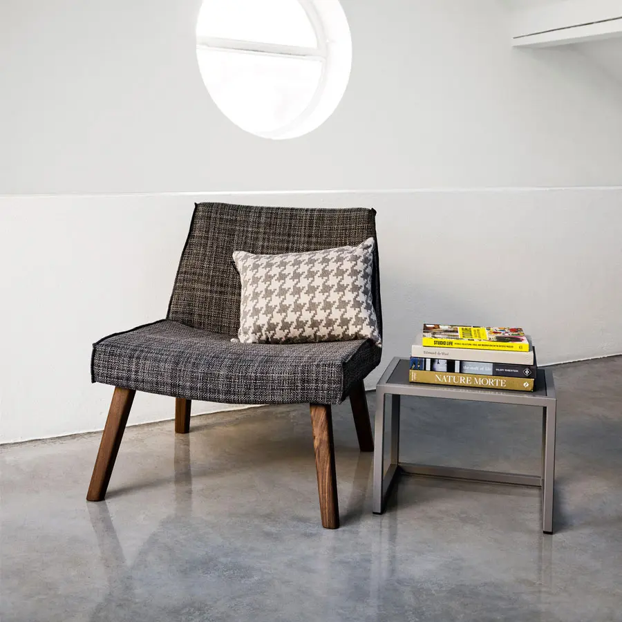 Diferentes materiales enfrentados para el sillón LC 24. Accesorio de decoración para completar la zona de dormitorio, tiene una forma compacta y, al mismo tiempo, acogedora. Se caracteriza por patas de nogal Canaletto natural, negro, blanco, gris, océano o tórtola, y una funda extraíble de tejido o cuero de imitación con costura francesa.