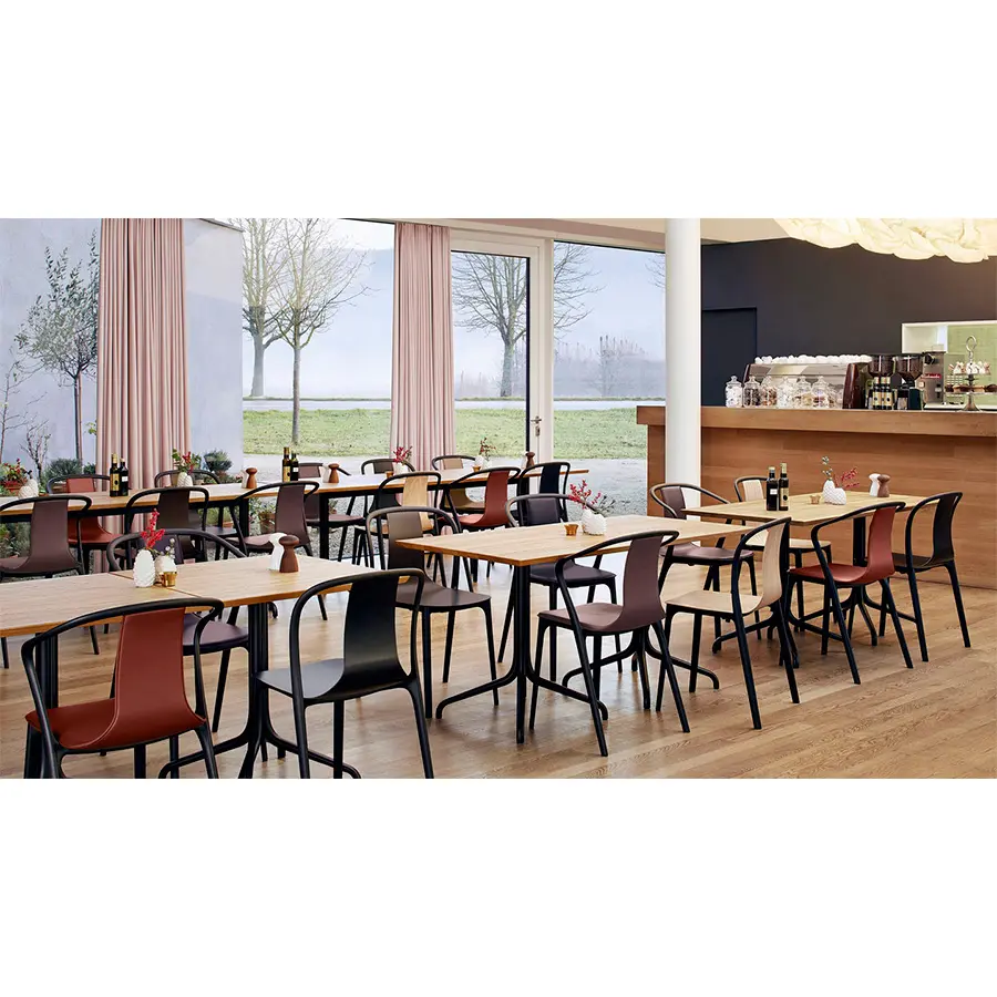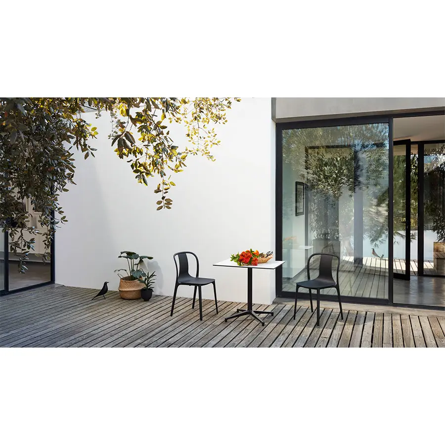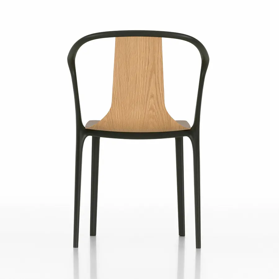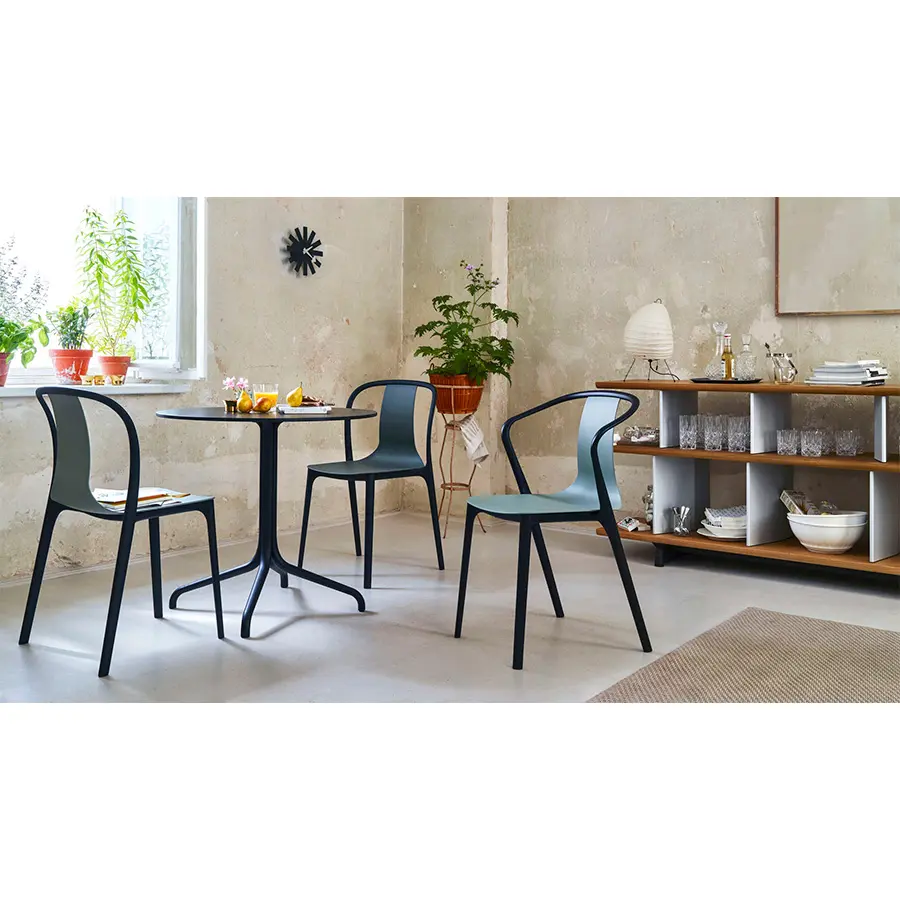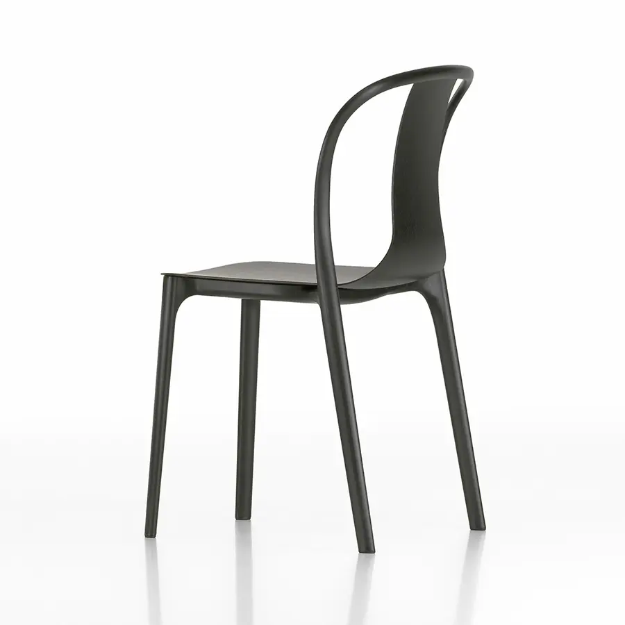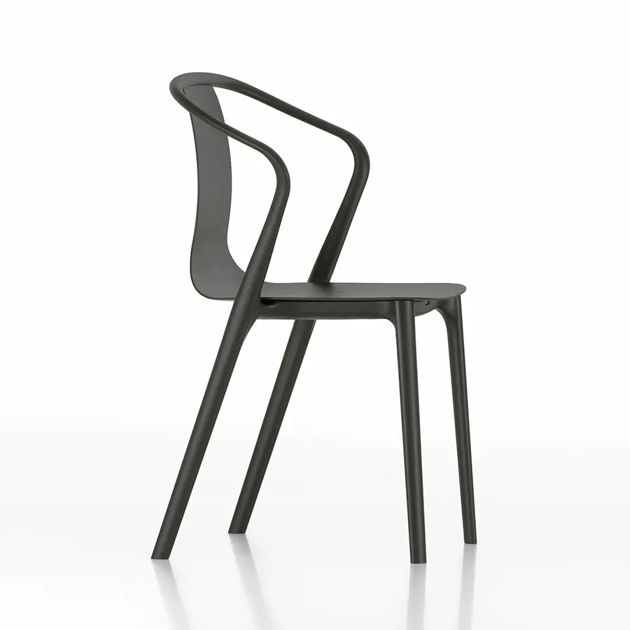 La Belleville Chair de plástico consta de dos componentes: un bastidor estructural y una carcasa de asiento. El elegante bastidor estructural traza las líneas caligráficas de las patas y el respaldo de la silla y está disponible con o sin reposabrazos inclinados hacia delante. La fina carcasa de asiento se estrecha hacia arriba desde el asiento para convertirse en el respaldo. Además de la versión de plástico de diferentes colores, la carcasa también se ofrece en contrachapado de madera laminada o tapizada en cuero o tela. Belleville Chair Plastic también es adecuada para su uso al aire libre.