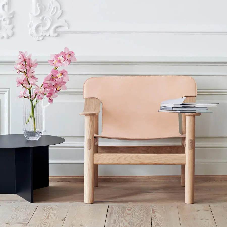 La butaca Bernard de Shane Schneck explora el género de la butaca dentro de un contexto contemporáneo. La yuxtaposición de un marco de madera maciza con una cubierta visualmente ligera crea una relación única entre los dos componentes, dando como resultado una silla cómoda y duradera con un lenguaje de diseño distintivo. El marco está elaborado en roble o haya maciza con diferentes acabados, y la cubierta deslizable está disponible en cuero o lona marina de alta resistencia.