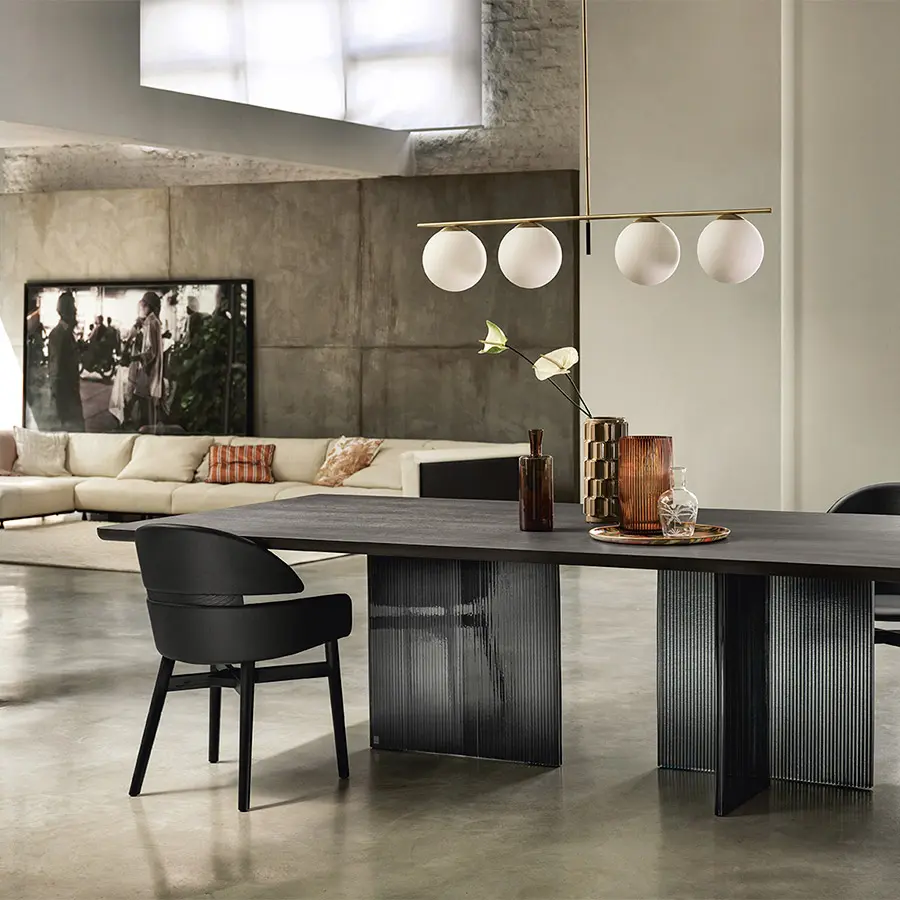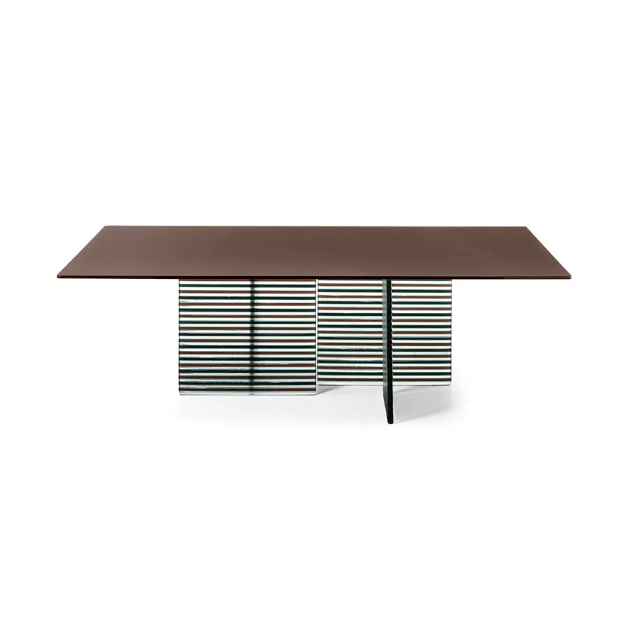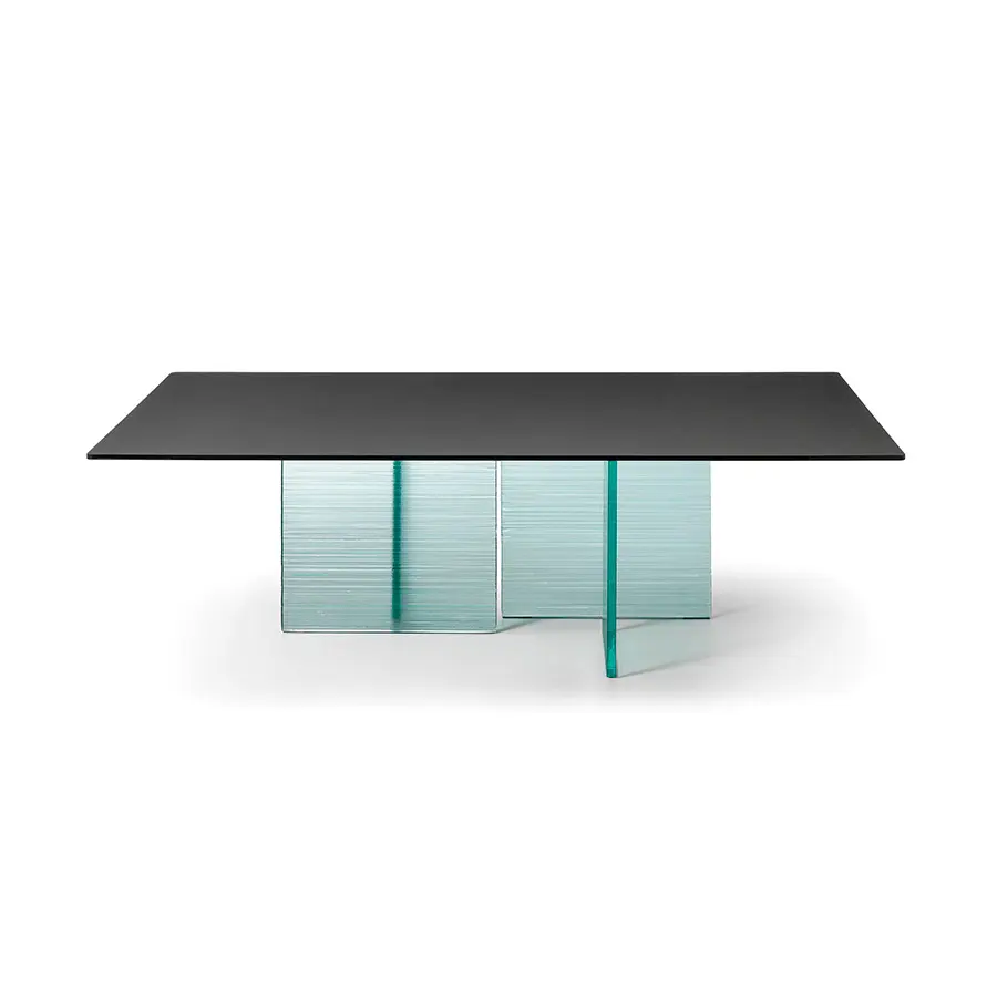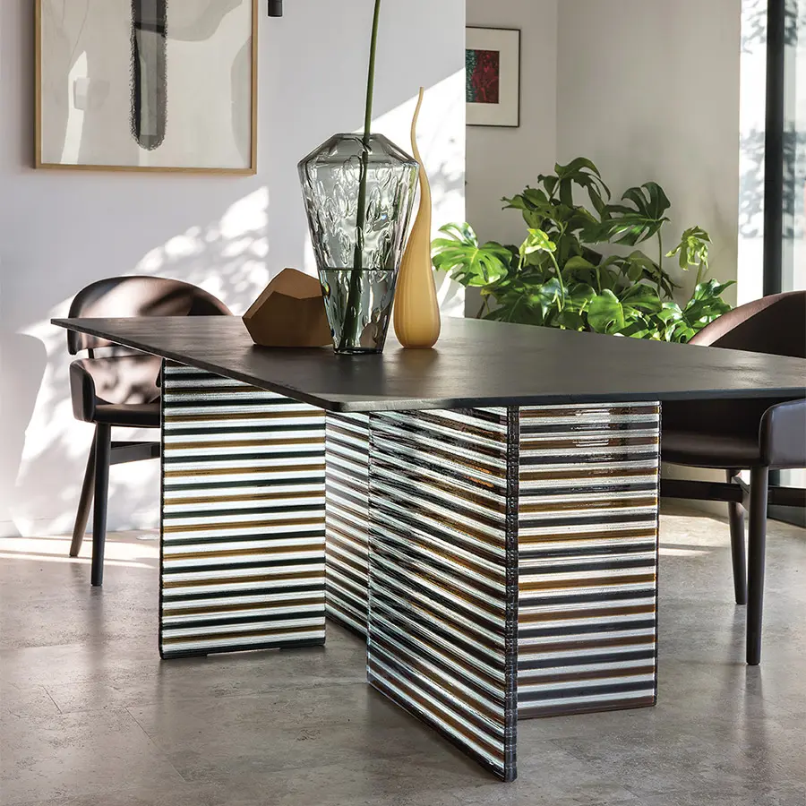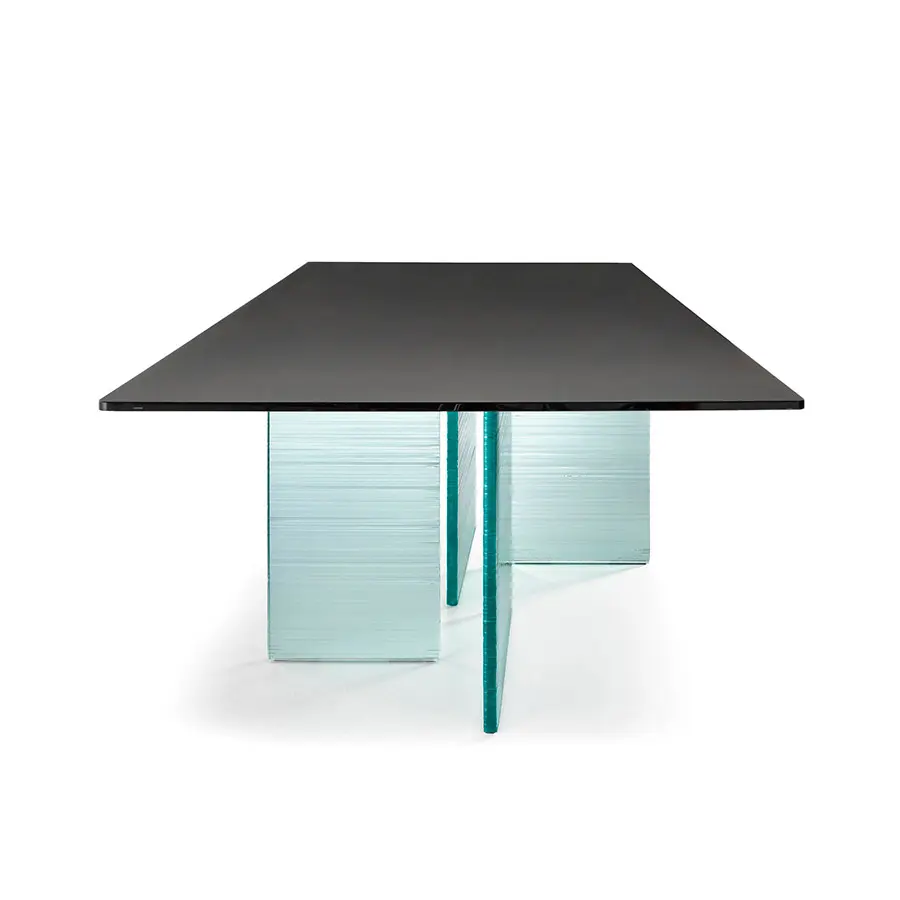 Mesa con base compuesta por cuatro elementos en vidrio DV de 30 mm transparentes o con rayas coloreadas. Tapa en vidrio de 12 mm o de 15 mm transparente retrobarnizado con tintas monocromàticas, o bien cubierto de Ecomalta espatulatura a mano de grano fino.