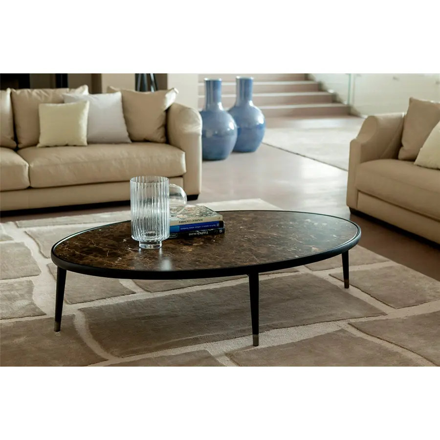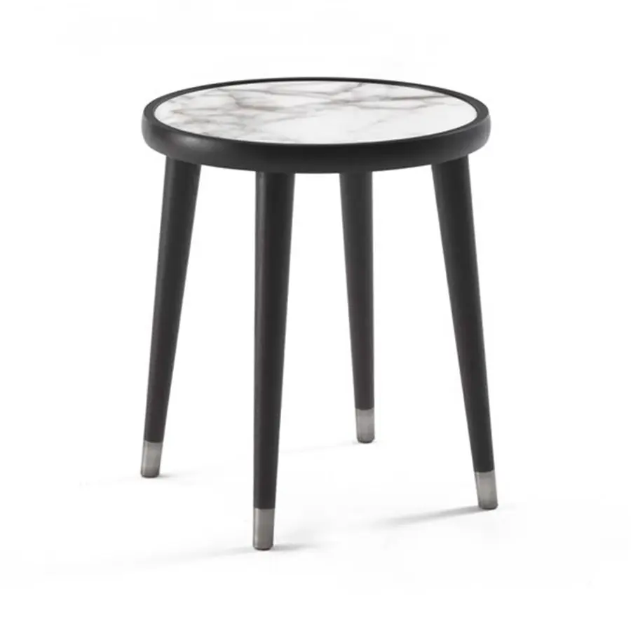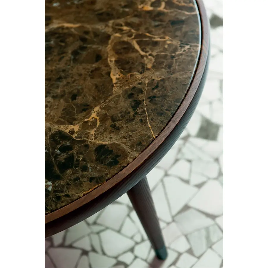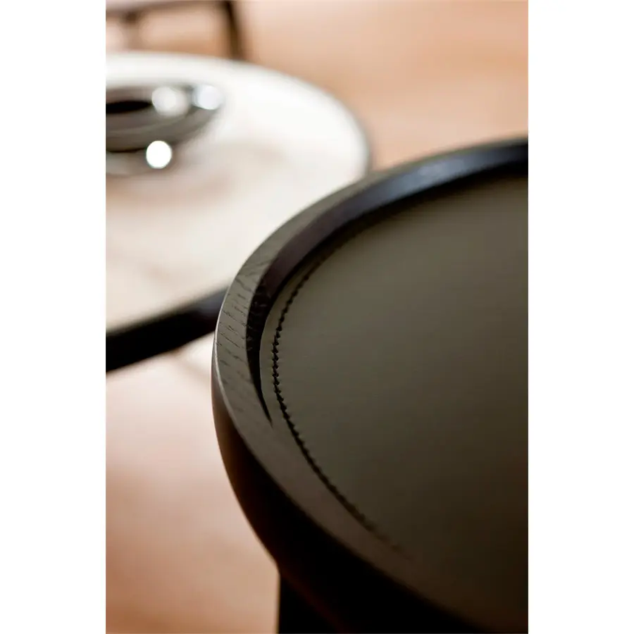 Serie de mesas de centro y auxiliares en fresno macizo con tapa en mármol, en madera o en cuero. Pies en metal.
