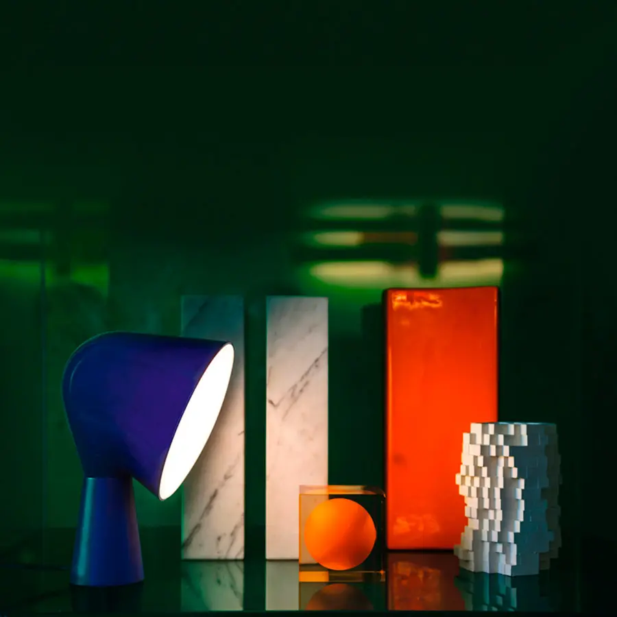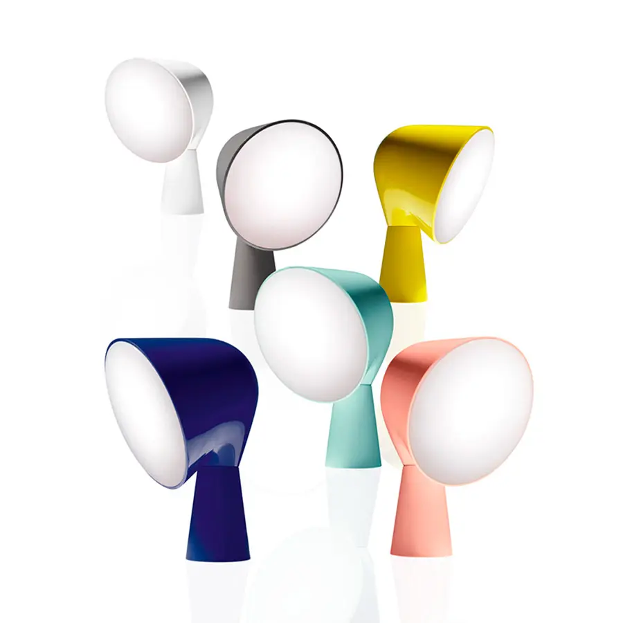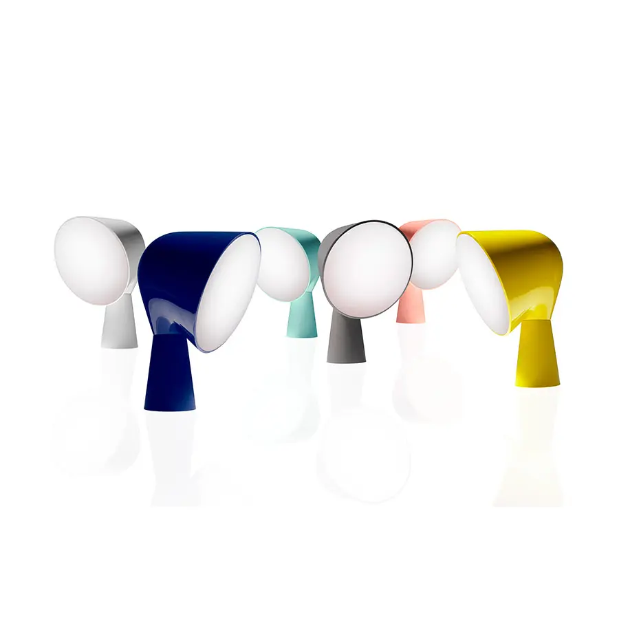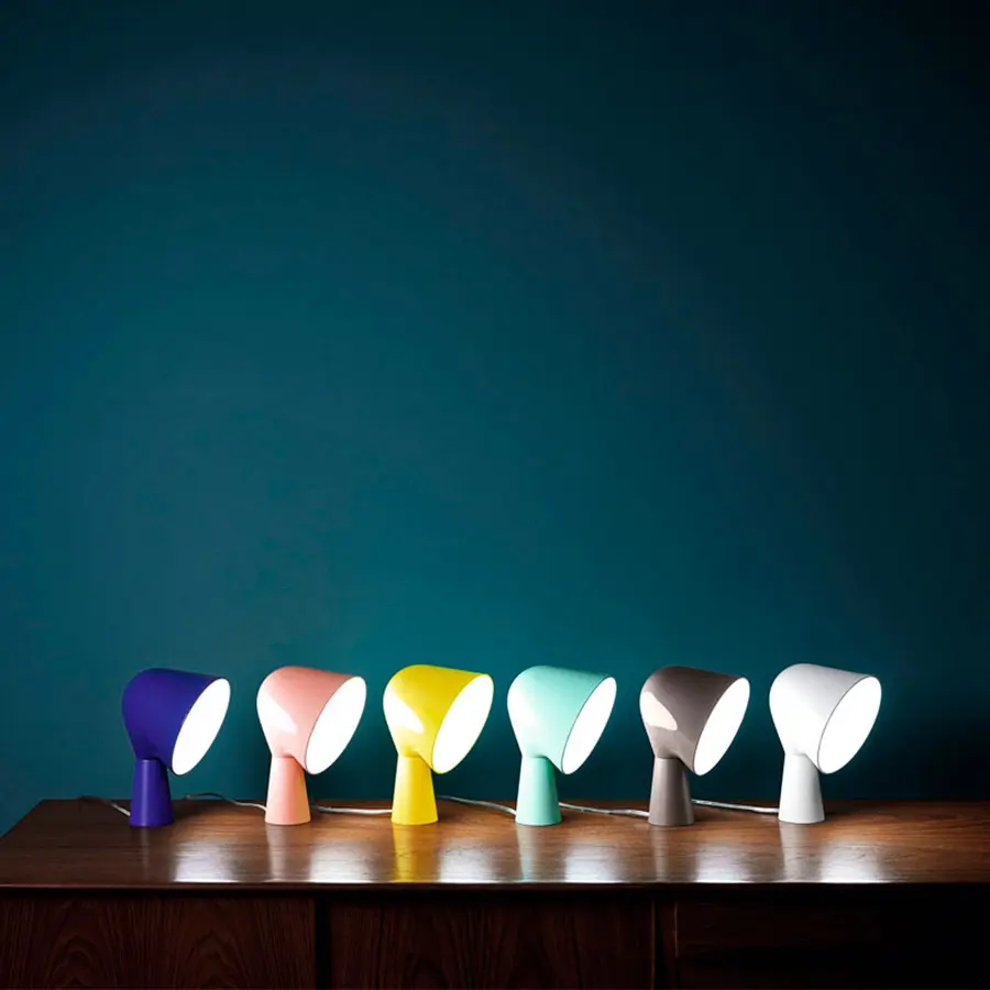 Binic es el nombre de un pequeño faro en la costa de Bretaña, la región natal de la diseñadora lonna Vautrin, que le ha servido de inspiración para crear esta pequeña lámpara de mesa de gran personalidad. Su forma alegre y sus colores estimulan la imaginación y suscitan una inmediata simpatía. El volumen superior redondeado, con acabado brillante, se apoya sobre una base cónica satinada, proyectando hacia abajo una luz intensa, restringida y homogénea. Gracias a su gama de 6 colores actuales se sintoniza con la personalidad de quien elige su versión preferida y puede amueblar diversos ambientes domésticos como el estudio, el dormitorio de los niños o de los adultos, o un rincón personal de la zona de día. Un embalaje creado por la diseñadora, igualmente especial y divertido, propone Binic como objeto "take away», idea regalo o lámpara personal.
