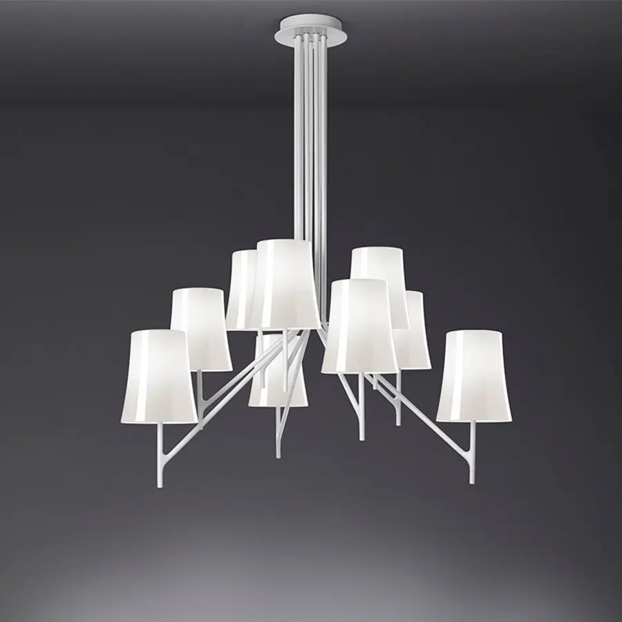 Un número variable de brazos con acabado blanco, finos como las ramas de un árbol invertido, sostienen pequeños difusores de color blanco, gris, naranja o amaranto: una composición elegante y poética al mismo tiempo, con además un toque de agradable personalización. La elección entre diversas versiones, con uno, tres, seis o nueve brazos, permite a su vez pasar del modelo más sencillo a aquellos cada vez más repletos de luces, que se multiplican como las llamas, hasta la escenografía de un moderno candelabro.