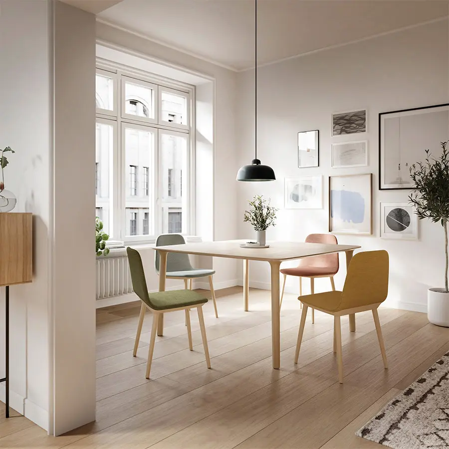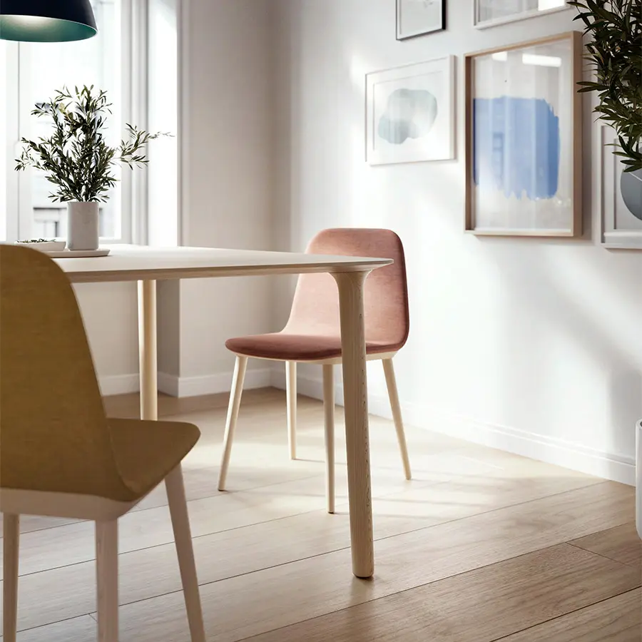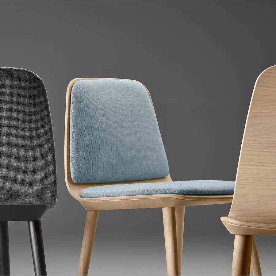 Tradición y contemporaneidad se equilibran en el diseño sereno y discreto de esta silla que pretende armonizar en los entornos cálidos y cercanos característicos de Treku. Su sencilla concepción combina tablero, macizos de madera y tapicería para obtener distintas opciones de acabados que junto a diferentes bases de madera y metálicas la hacen apta para gran variedad de situaciones y usos ya sean en el ámbito particular así como en el contract.
