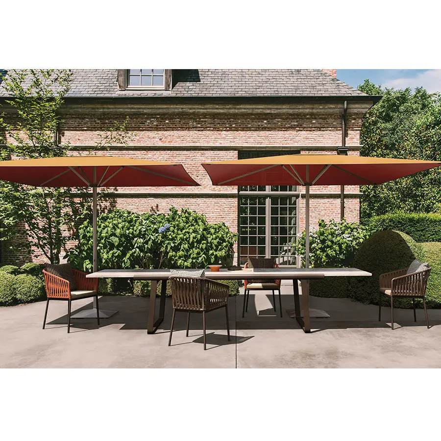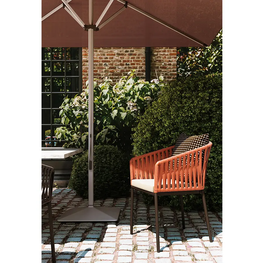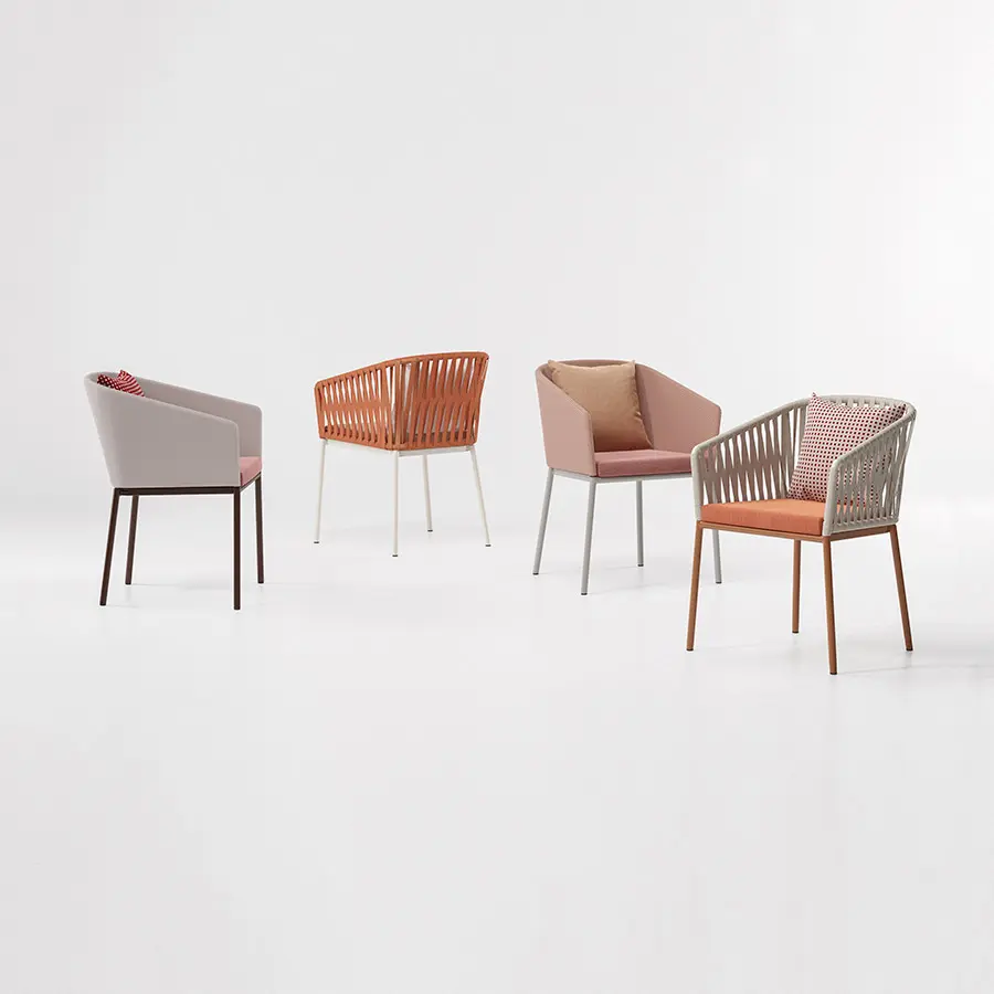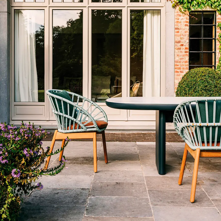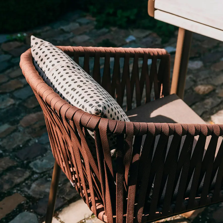 Silla Bitta fabricada de estructuras de aluminio, asientos trenzados con cuerda de poliéster y cómodos cojines, materiales perfectamente resistentes a la intemperie. “La intención del diseñador era crear un trenzado denso pero que respirara que recordara el trenzado de los cabos que se utiliza para amarrar las barcas a los amarraderos (de ahí el nombre Bitta, que significa ‘amarradero’ en italiano)–, que confiriera a las piezas una sensación de ligereza pero, que éstas se vieran como nidos acogedores en tonos naturales en los que relajarse.”