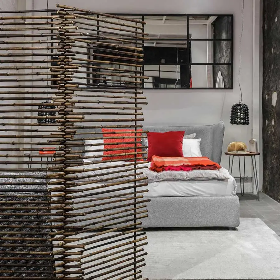 Mampara de tres hojas con cierre de libro, Black 90 resalta la naturaleza del bambú negro: cañas finas de longitudes diferentes están superpuestas encastradas para otorgar dinamicidad al producto. Un juego de llenos y vacíos y de visibles e invisibles que se vuelve posible gracias a las líneas de fuga entre una caña y otra, que permiten que la vista vaya más allá.