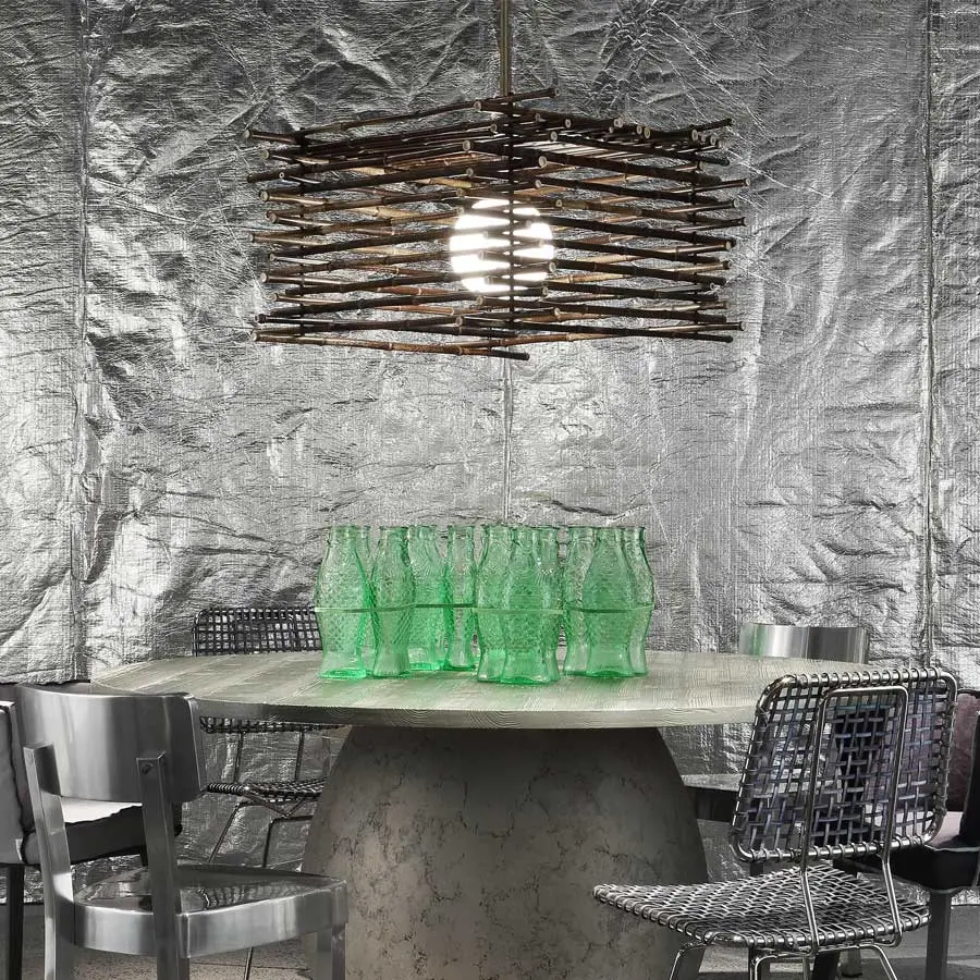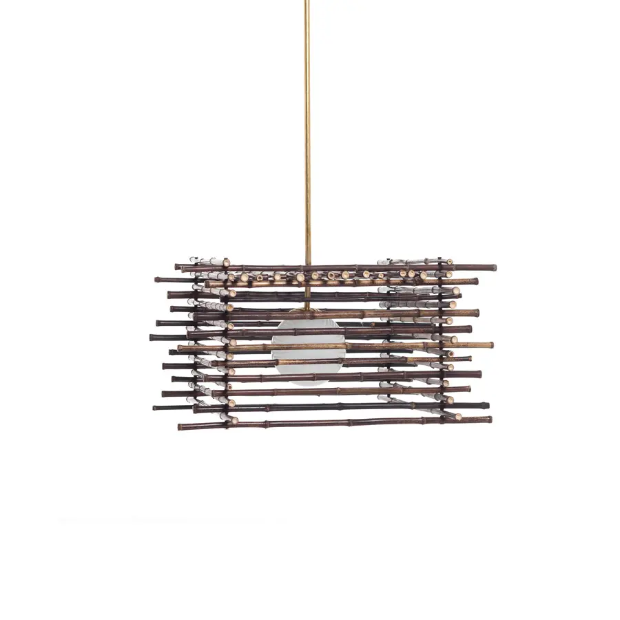 La lámpara colgante Black 94 remite a una estética exótica y minimalista. El cuerpo iluminado de vidrio opalino con vástago de latón bruto está revestido por una pantalla de bambú negro de forma cuadrada: las cañas, que crean una caja de protección en torno a la lámpara, permiten que la luz pase, creando un juego dinámico de llenos y vacíos y de efectos luminosos en el ambiente circundante.