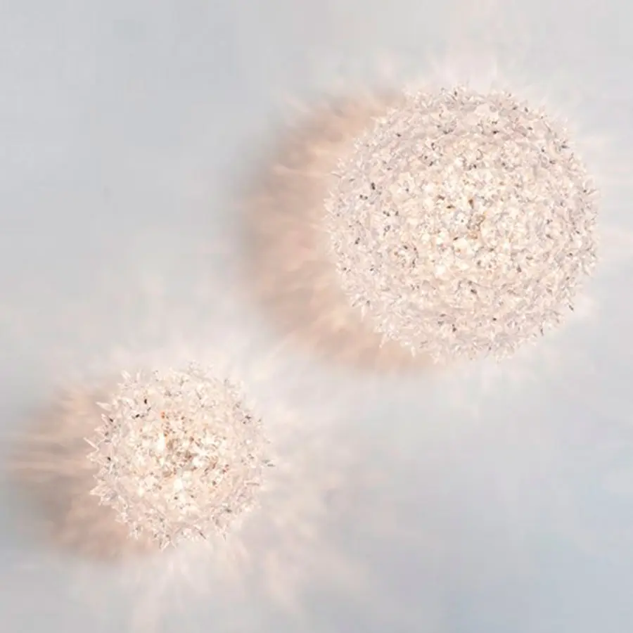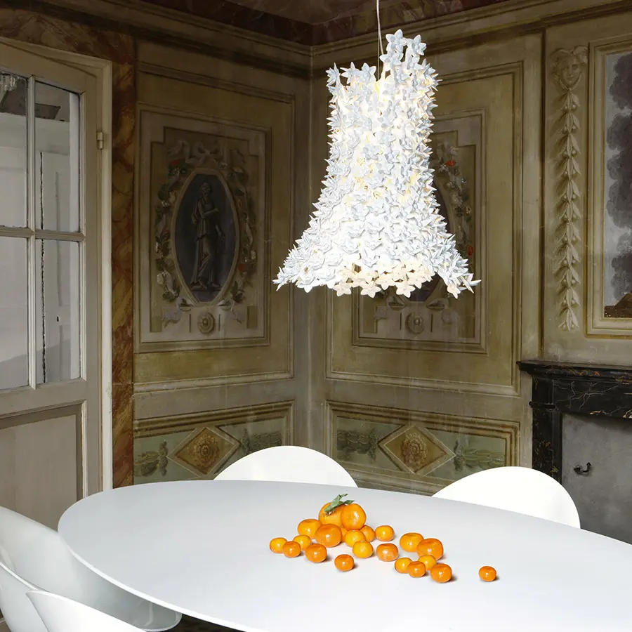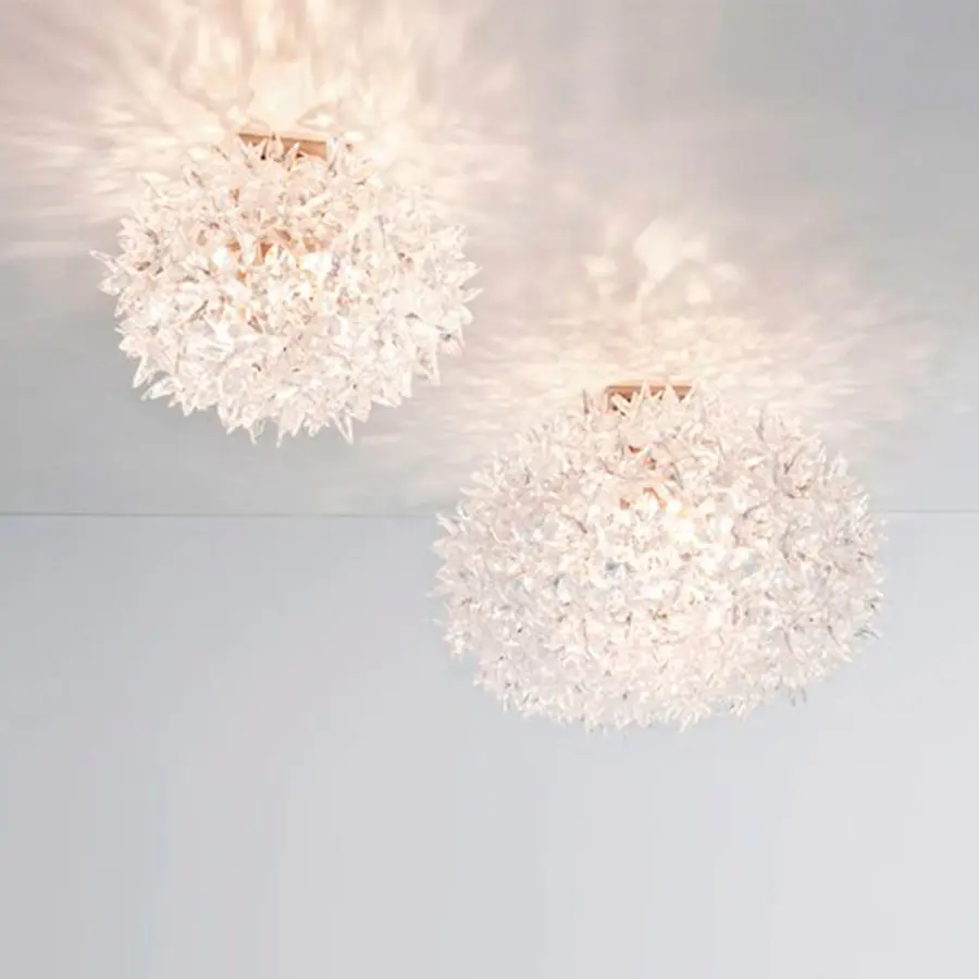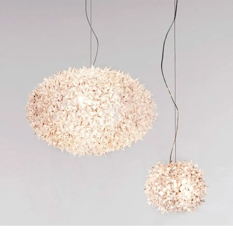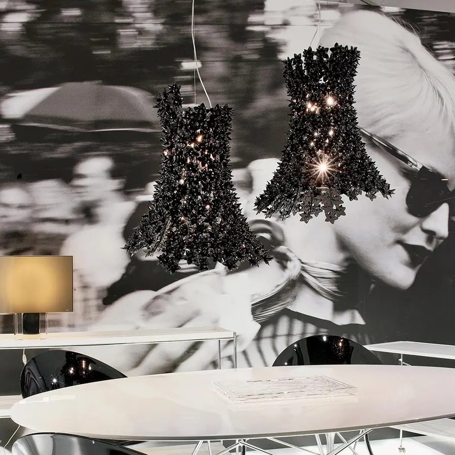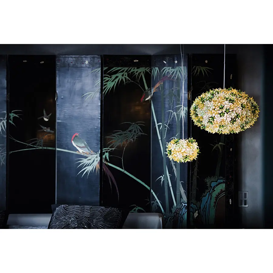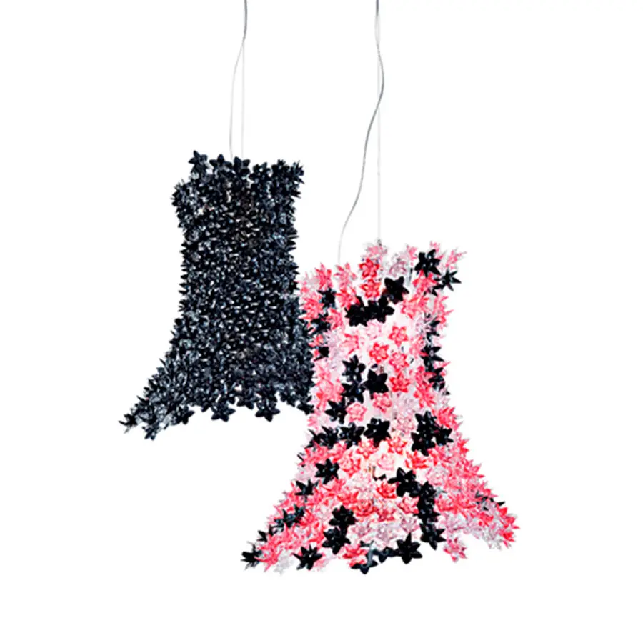Una lámpara preciosa como el cristal de Murano e irreverente como una obra de rock: Bloom nace como una chispeante y espléndida cascada de flores con efecto de cristal. Bloom se compone de un esqueleto tubular de policarbonato, recubierto completamente con una estructura de pequeñas flores de doble corola. El resultado es una lámpara de producción industrial, pero con las formas y la complejidad estilística de un objeto artesanal de una pieza. Una serie de bombillas colocadas sobre el esqueleto interno difuminan el haz luminoso a través de los pétalos, que hacen que la luz se refracte sobre las superficies cortadas de los pétalos y que se difundan mil reflejos.