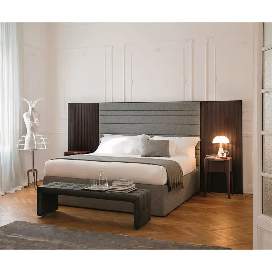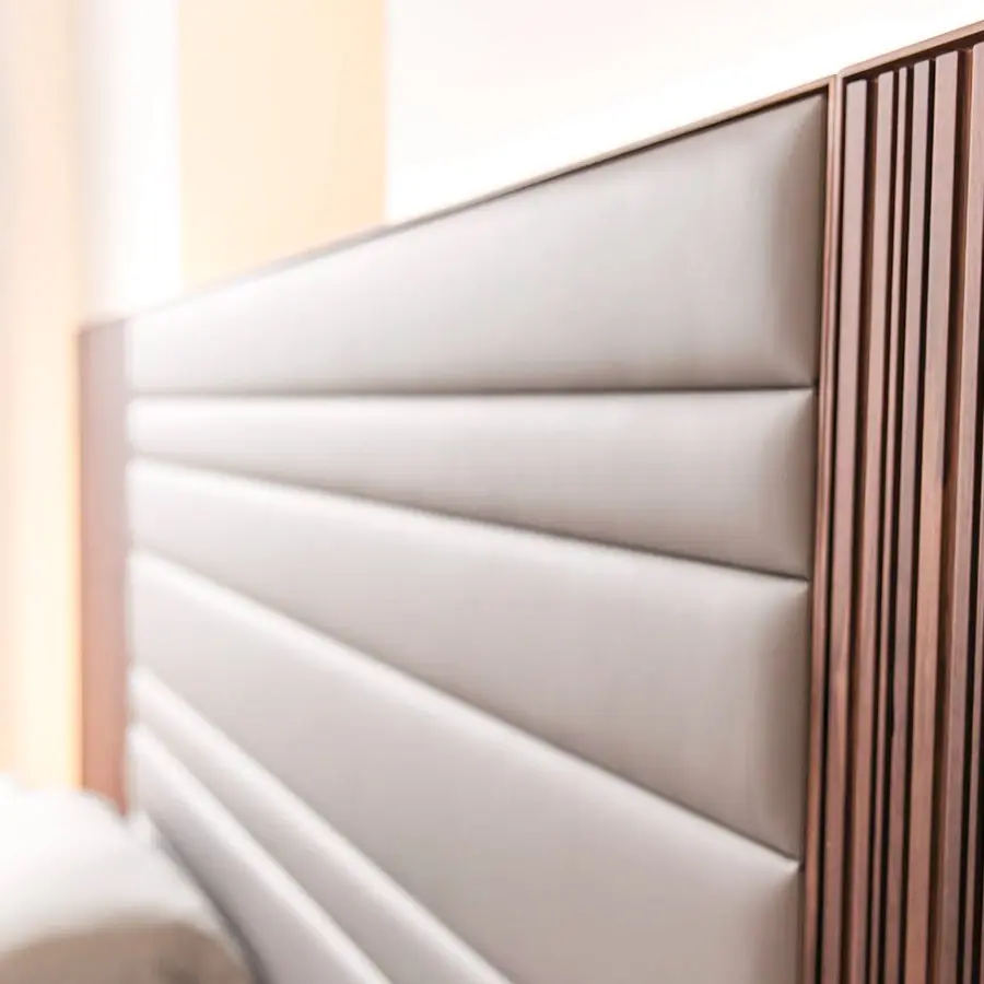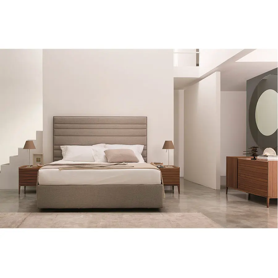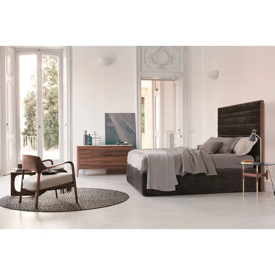 Cabecera con marco en nogal canaletta macizo y revestimiento en las telas de la colección. Posibilidad de añadir modulos laterales en nogal canaletta macizo. Fijada a pared. Luz trasera LED disponible bajo petición. Las medidas en ancho se ajustarán a las medidas necesarias del sommier, la altura es de 160cm de altura, dotándola de un carácter elegante, que envuelve todo dormitorio.