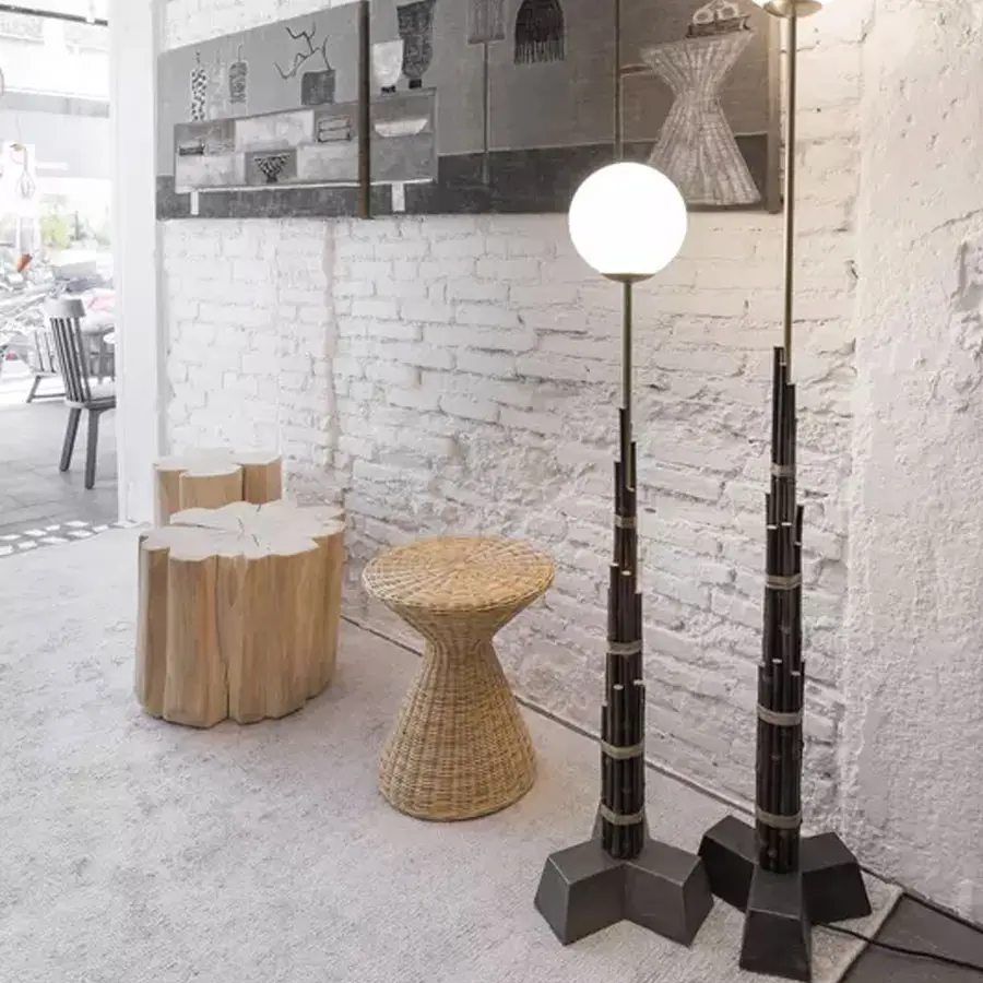 Familia de mesas de centro-puf completamente realizada en mimbre tejido natural, mélange o lacado en blanco mate, gris, negro, océano o tórtola, caracterizada por una forma de clepsidra y por un sabio juego de elaboraciones, formas y colores. Se destaca gracias a la belleza del tejido de fibra natural combinado con un diseño original, que le otorgan carácter y singularidad al producto.