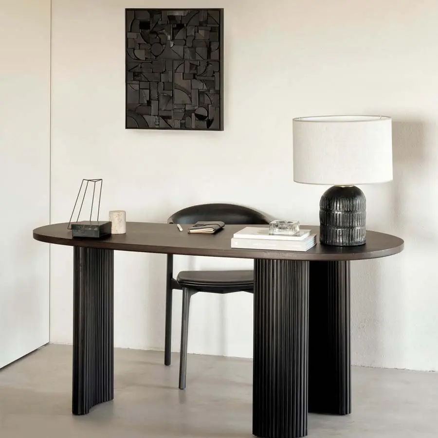 Inspirada en las formas de la naturaleza, la colección Boomerang presenta un alegre conjunto de tableros de guijarros sobre patas curvadas con un efecto de palos de madera apilados. El escritorio Boomerang es de madera maciza de caoba teñida de marrón oscuro con un acabado barnizado. Una pieza de referencia para cualquier espacio de trabajo con su diseño orgánico y llamativo único para la oficina.