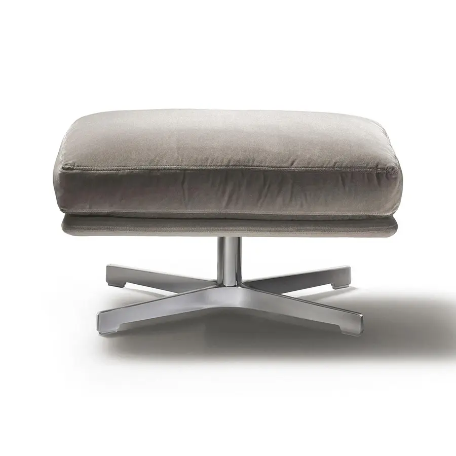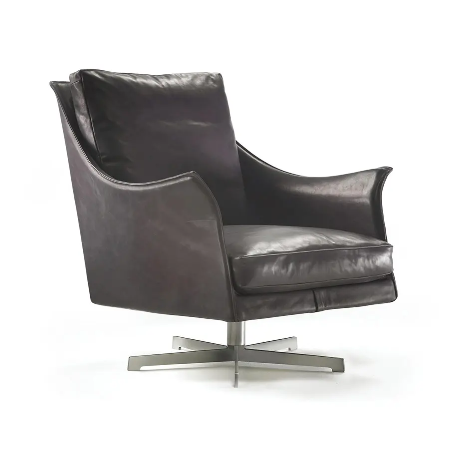 Importante y estructurado, Boss desempeña tanto el papel de sillón ejecutivo si se coloca en el despacho como el de nido acogedor dentro del espacio doméstico. La carcasa de metal y de espuma de poliuretano está tapizada en tejido a juego, y ofrece un excelente apoyo para la espalda; los cojines del asiento y del respaldo, con su generoso relleno de plumón de ganso, garantizan una sensación de gran comodidad. El sillón Boss está disponible en las versiones con patas o con base giratoria de cinco radios, ambos de metal y disponibles en los acabados cromado, satinado, bruñido, cromado negro y champán. El sillón Boss se puede combinar con el pouf reposapiés del mismo nombre.