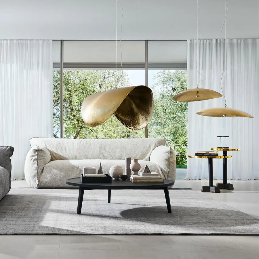 De fuerte impacto decorativo, la familia de lámparas BRASS explota la ductilidad del latón y su capacidad de embellecer los interiores con reflejos luminosos cálidos y dorados. Las lámparas colgantes tienen una forma delicada, de gran atractivo visual: un ligero disco de latón, con una ligera curvatura en la versión más pequeña o muy acentuada en la más grande, que flota en el aire, reflejando la luz en modo poético y sugerente. Pueden utilizarse individualmente o combinadas entre sí para lograr un efecto todavía más atractivo o escenográfico. Considerando la total artesanía del producto, es posible que con el tiempo aparezcan pequeñas manchas debido a la oxidación del latón. Estas manchas no hay que considerarlas defectos, sino una característica del material. Pequeñas marcas superficiales, rayones, arrugas, etc. se deben al proceso artesanal de martilleo sobre el latón y, por lo tanto, son característicos de la fabricación del producto.