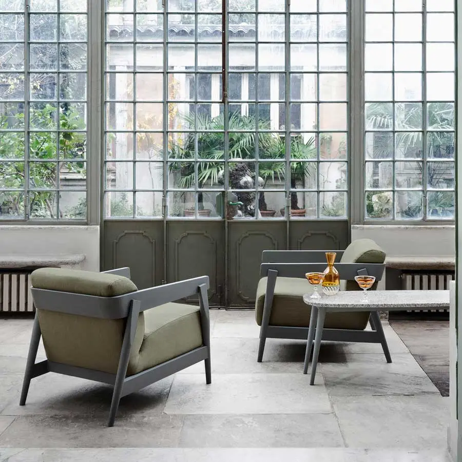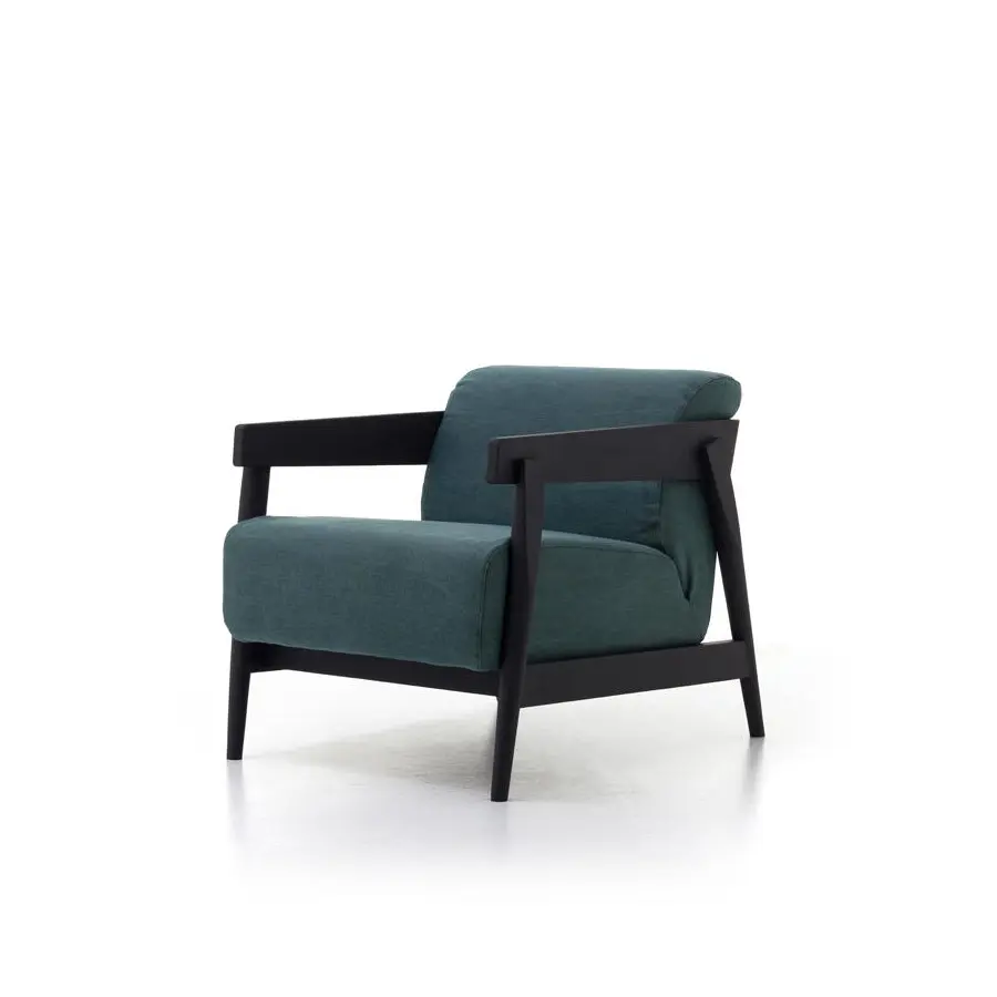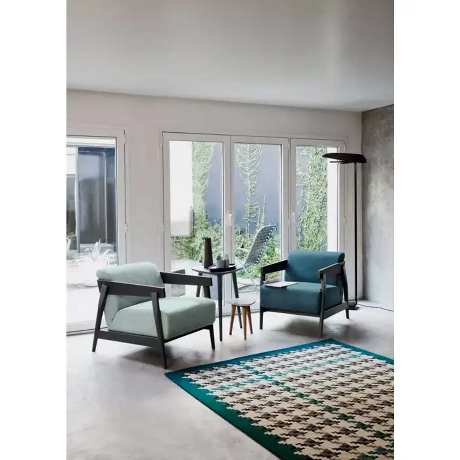Sillón con estructura de madera maciza de nogal Canaletto natural, roble blanqueado o roble lacado en blanco, gris, negro, océano o tórtola, Brick 305 tiene el asiento y el respaldo mullidos gracias a un único e importante cojín relleno de poliuretano expandido, con funda extraíble. Los variados elementos de madera que componen la estructura son evidentes, inclinados y superpuestos.