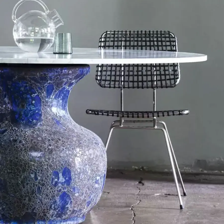 La silla Brick 23 sin brazos tiene una estructura de varilla de acero cromado brillante. Las líneas ligeras y los espesores sutiles están enfatizados por el entramado de pergamino gris del asiento y del respaldo.
