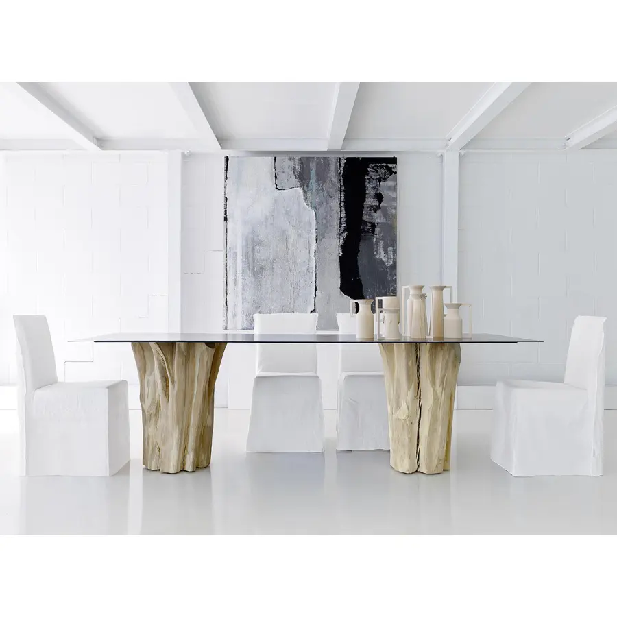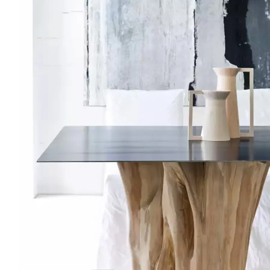 Un signo fuerte y distintivo caracteriza a la familia de mesas Brick 32/33/34/36. Las referencias nórdicas son evidentes en la importante base en secciones de tronco de carpe natural descortezado, que se pone en contraste visual con el fino tablero de chapa de hierro encerada. Disponibles en variados tamaños y con tableros rectangulares, cuadrados y redondos, combina materiales naturales con toques industriales.