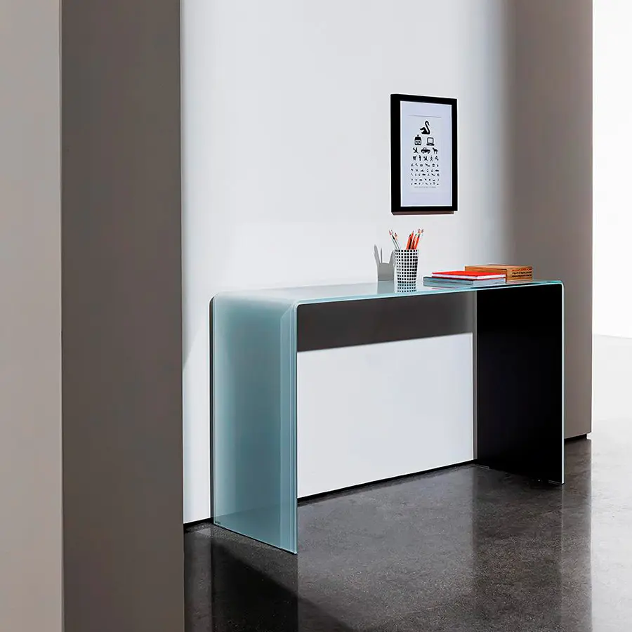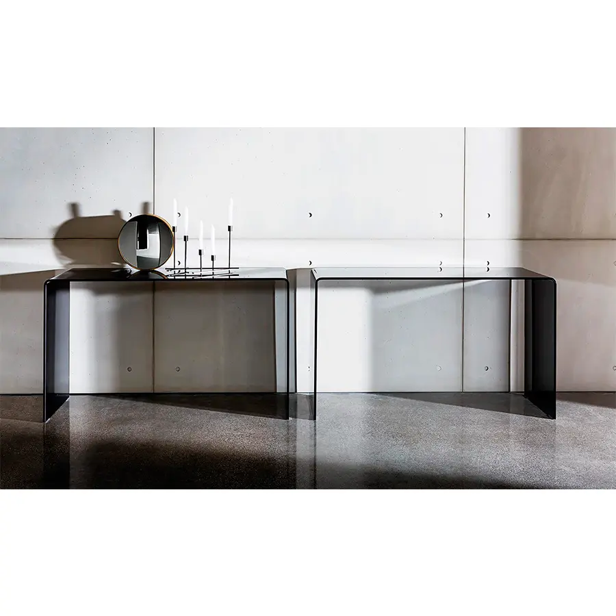 Bridge es una línea de mesas, mesas de café, consolas y escritorios que presenta el encanto del vidrio en diferentes ambientes: sala de estar, dormitorio y oficina. Disponible en diferentes acabados, desde el extralight hasta el ahumado o vidrio lacado.