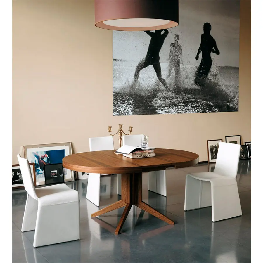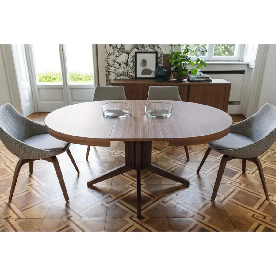 Mesa de comedor redonda con base en roble o nogal canaletta macizo. Extensible. La extensión central se repliega debajo de la tapa.