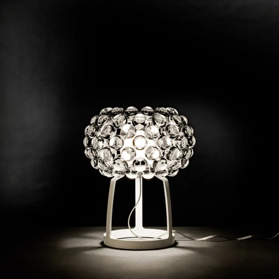 Rica, brillante y sofisticada, la lámpara Caboche es un mosaico de refracciones, una fusión perfecta en una única forma de diversas individualidades que realizan en su conjunto el cuerpo y el efecto luminoso de la lámpara. Cuando está encendida, la luz se propaga desde el interior de las esferas como si se tratara de cristales luminosos, iluminando el ambiente a 360° y garantizando al mismo tiempo una iluminación hacia abajo. Caboche de mesa es una pequeña joya de creatividad y de tecnología que se encuentra disponible en dos versiones: transparente y amarillo oro. El original diseño del vástago está formado por tres apoyos que unen la base redonda con el recuerdo de la forma esférica del difusor, garantizando de esta forma coherencia, originalidad y ligereza al conjunto. Caboche es adecuada para ambientes privados y públicos, ocupa un lugar de protagonista y combina impacto visual con ligereza, valor decorativo y funcionalidad.