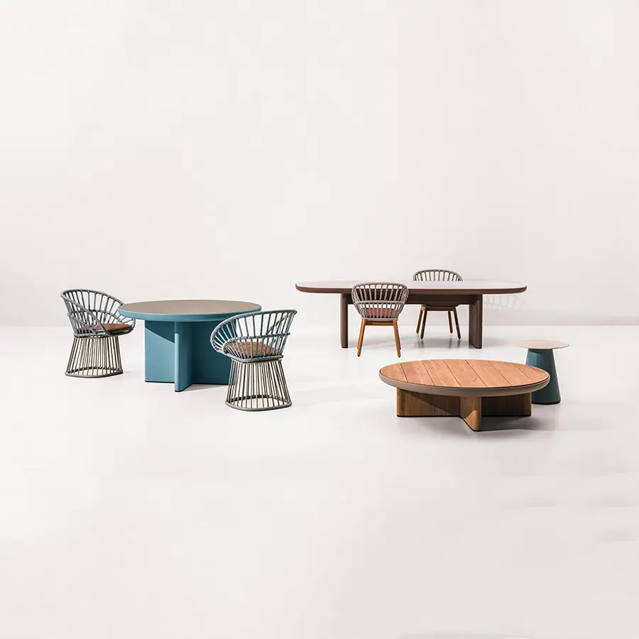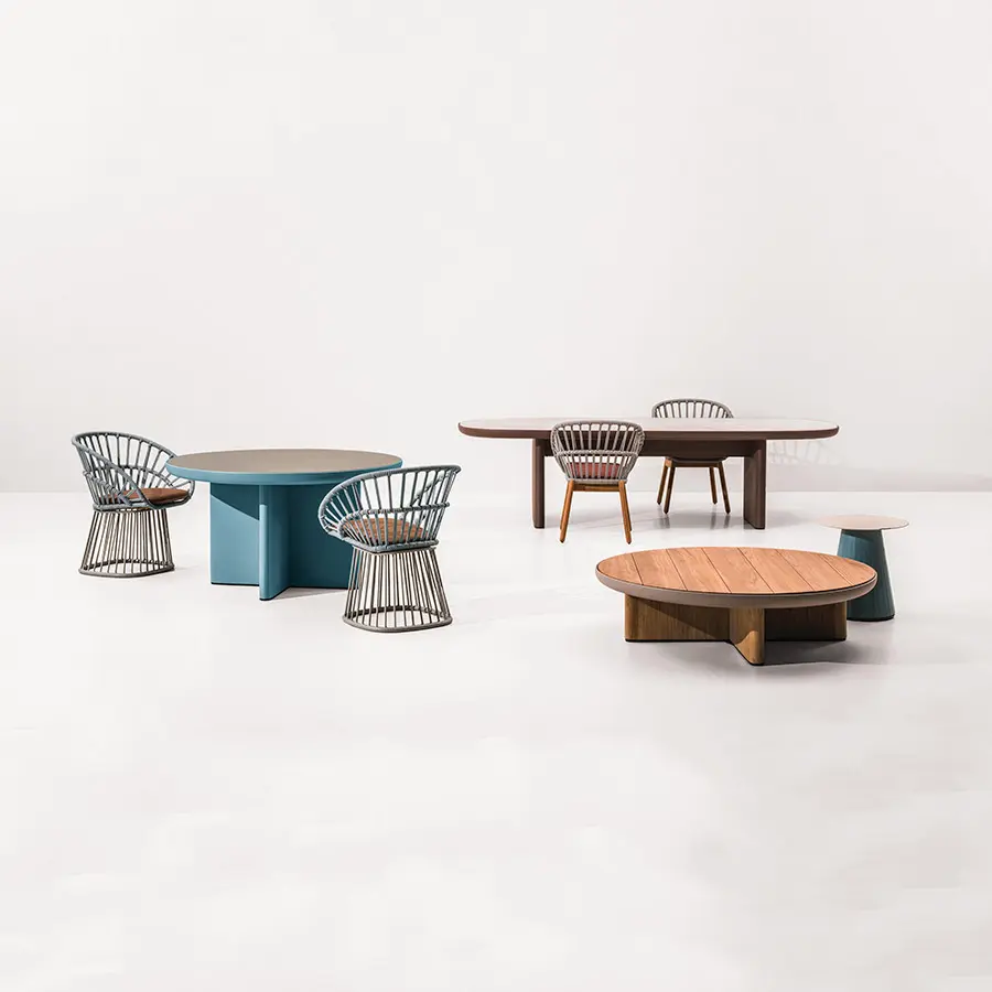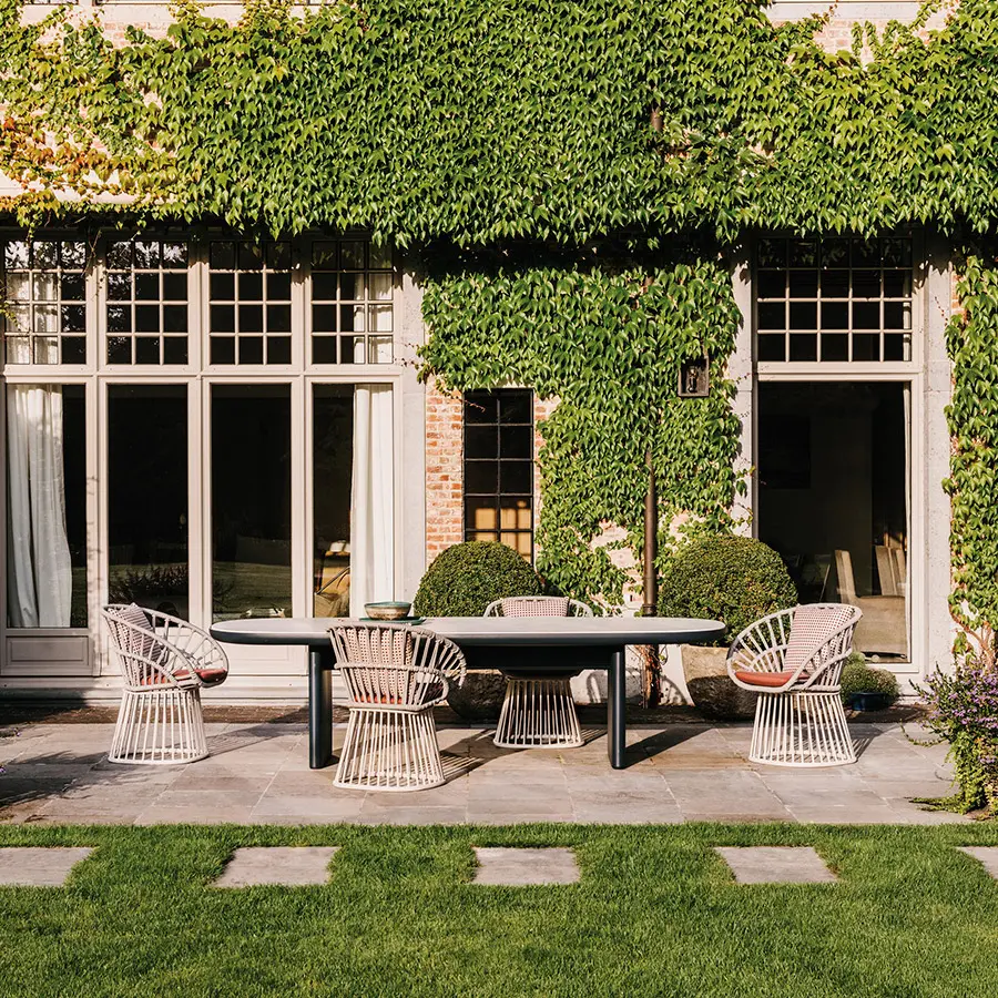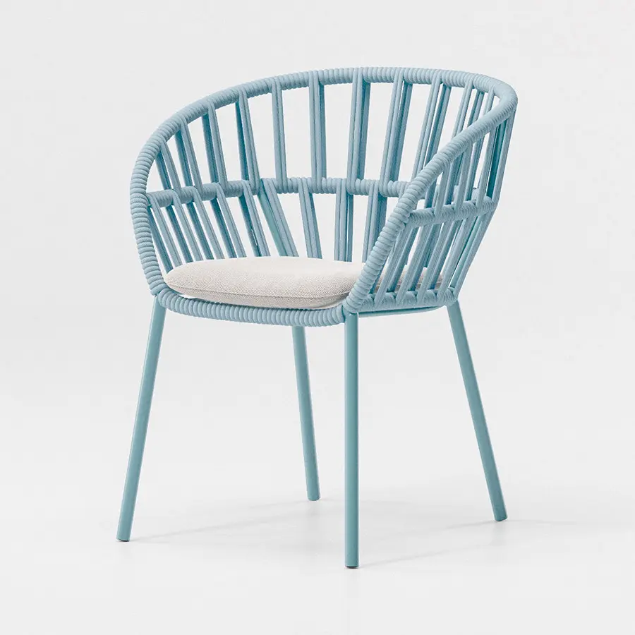 Cala es un sillón de superficies ligeras y transparentes que le confieren una presencia majestuosa. El tejido abierto de cuerda hace las veces de una celosía, que aporta privacidad visual al tiempo que mantiene una conexión con los elementos naturales. Cala se puede utilizar tanto para cenar como para relajarse. La amplia selección de revestimientos metálicos, colores de cuerda y telas para cojines ofrece numerosas posibilidades para adaptar la identidad del sillón a distintos proyectos.