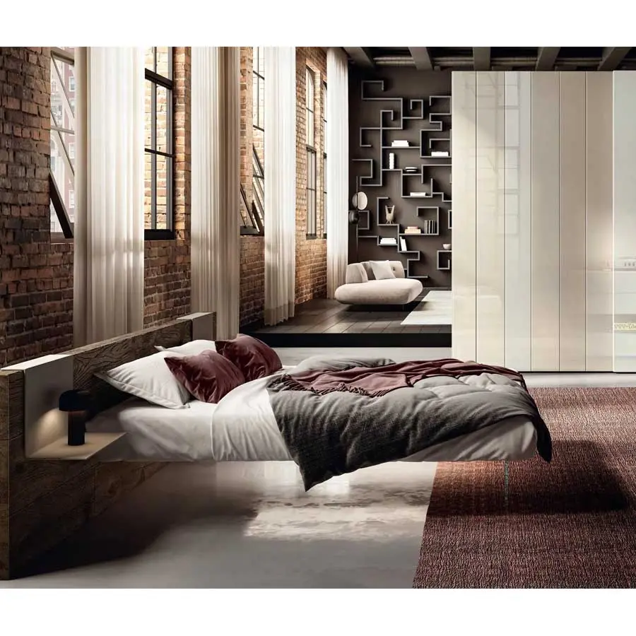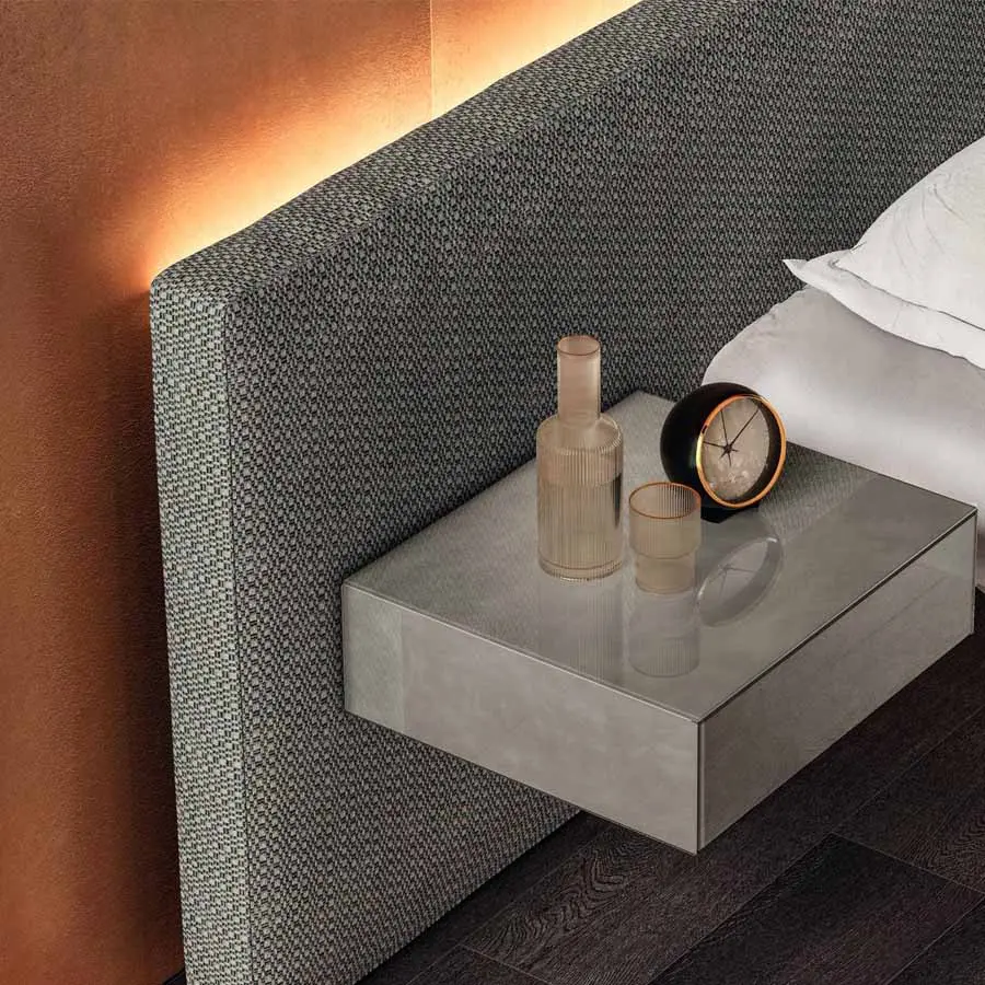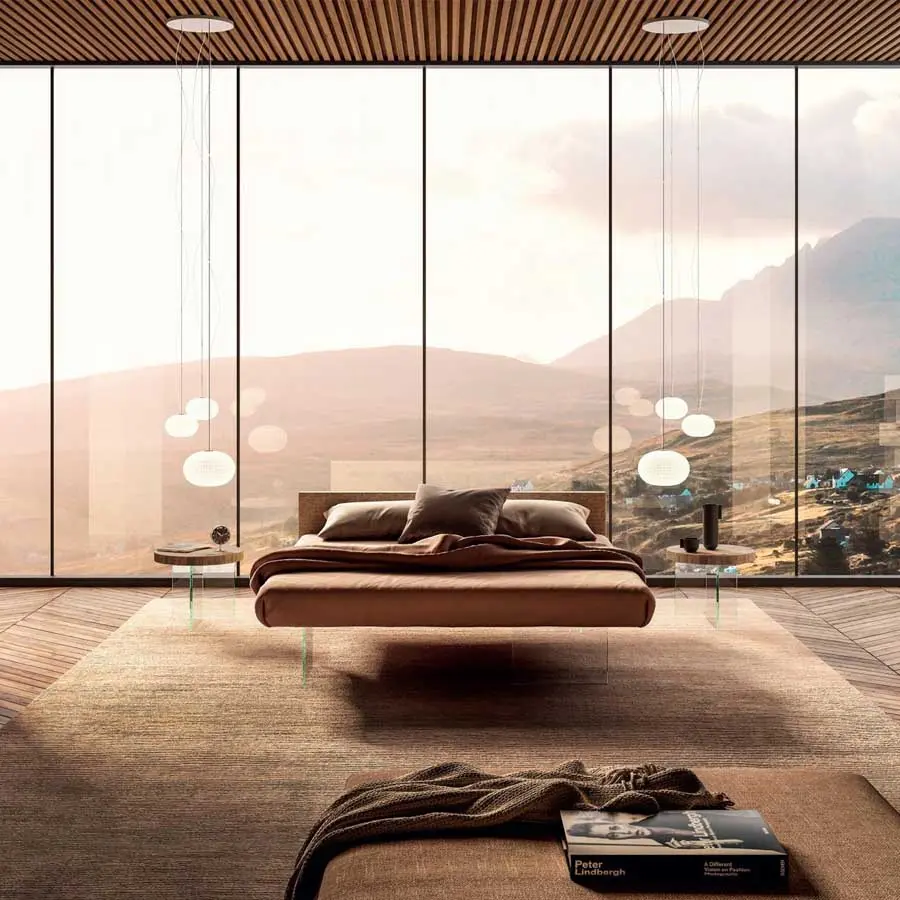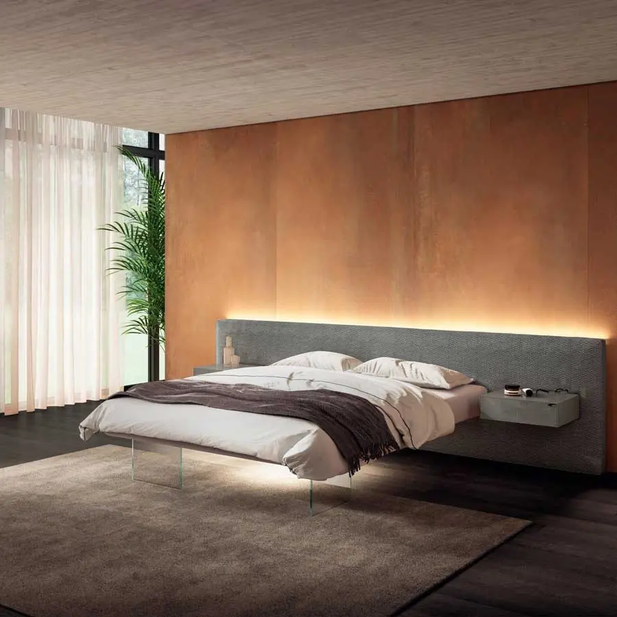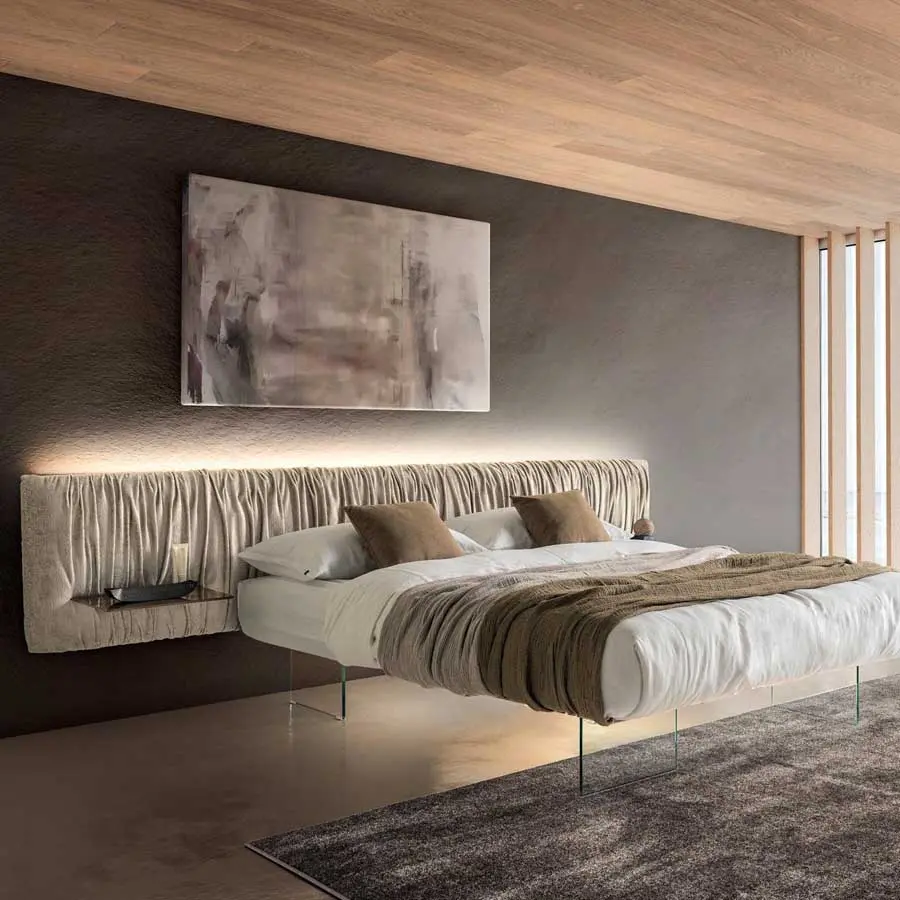 Gracias a la absoluta transparencia de los soportes en cristal templado extraclaro, la cama moderna Air parece flotar en el vacío, infundiendo una gran sensación de ligereza en el dormitorio. Las cabeceras de las camas LAGO son infinitamente personalizables y equipables: en madera de roble Wildwood, en tejido liso o arrugado, fijadas a pared con repisas integradas o soluciones freestanding para combinar con funcionales mesillas de noche, se adaptan a cualquier contexto y estilo. Bajo el somier de la cama es posible incluir un sistema de iluminación LED que permite enfatizar aún más el sugestivo e icónico efecto de suspensión. En todas sus versiones, matrimonial, individual o de plaza y media, la cama Air es una cama elegante y refinada que se inserta a la perfección en cualquier tipo de diseño de interiores y gracias a la ausencia de marco facilita la limpieza del dormitorio.