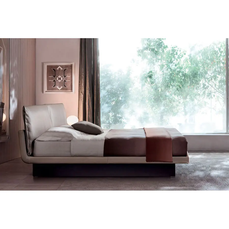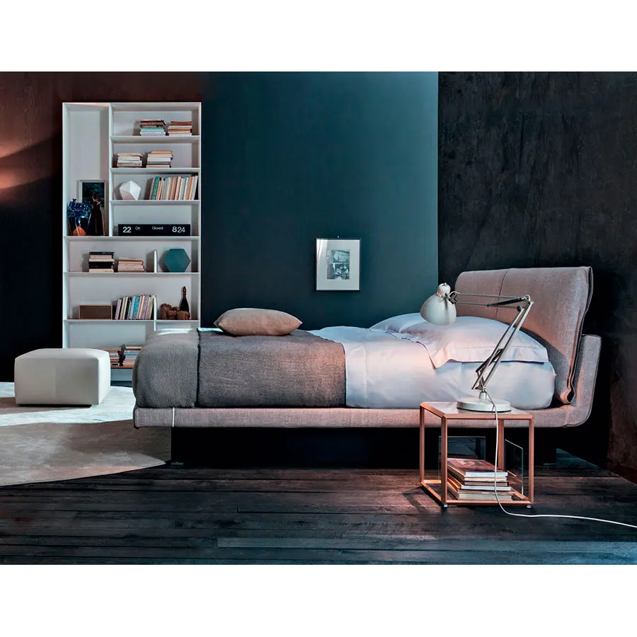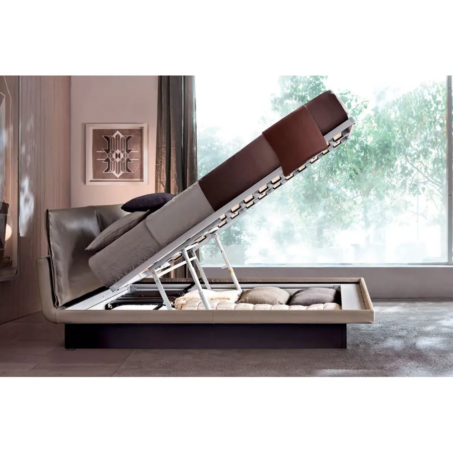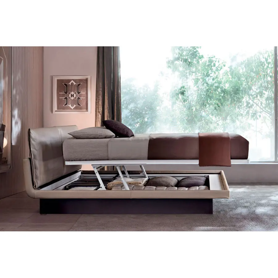 Una cama sencilla pero elegante, caracterizada por revestimientos en textil o piel, enriquecidos por materiales y procesos de confección de sastrería, típicos de los modistos más refinados. Honey propone una línea moderna para la cama textil de tamaño reducido, también diseñada para ambientes recogidos. El contenedor bajo el somier disfruta de un mecanismo basculante de nuevo concepto estudiado para facilitar el acceso al módulo. En versión con contenedor el somier puede colocarse en dos posiciones: apertura frontal para mover los materiales y elevación horizontal para hacer la cama con facilidad.