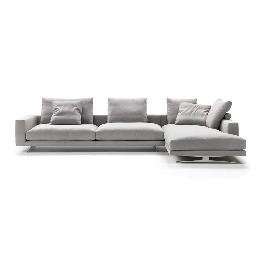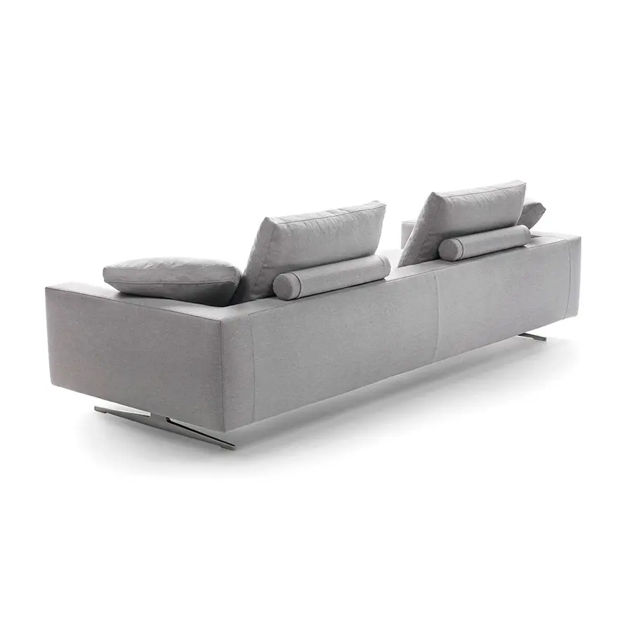 Los cojines de los asientos tienen un inserto central de material indeformable envuelto en una generosa y suave capa de plumón de ganso. Los cojines del respaldo también están hechos de pluma para amplificar la sensación de suavidad envolvente y están disponibles en versiones con o sin cilindro para obtener diferentes resultados tanto desde el punto de vista estético como ergonómico. El cojín cilíndrico proporciona un mayor soporte para la espalda y el cuello. El sofá descansa sobre una elegante base de aluminio fundido a presión barnizado en gris y bronce, o satinado, cromado, bruñido, cromo negro y champán.