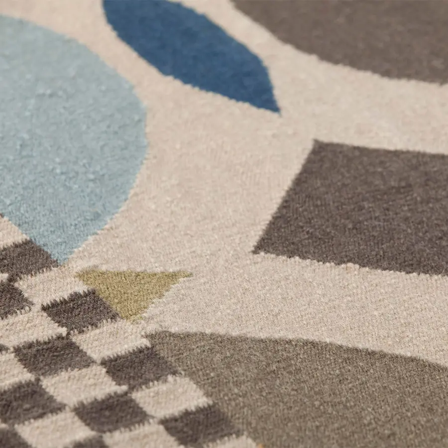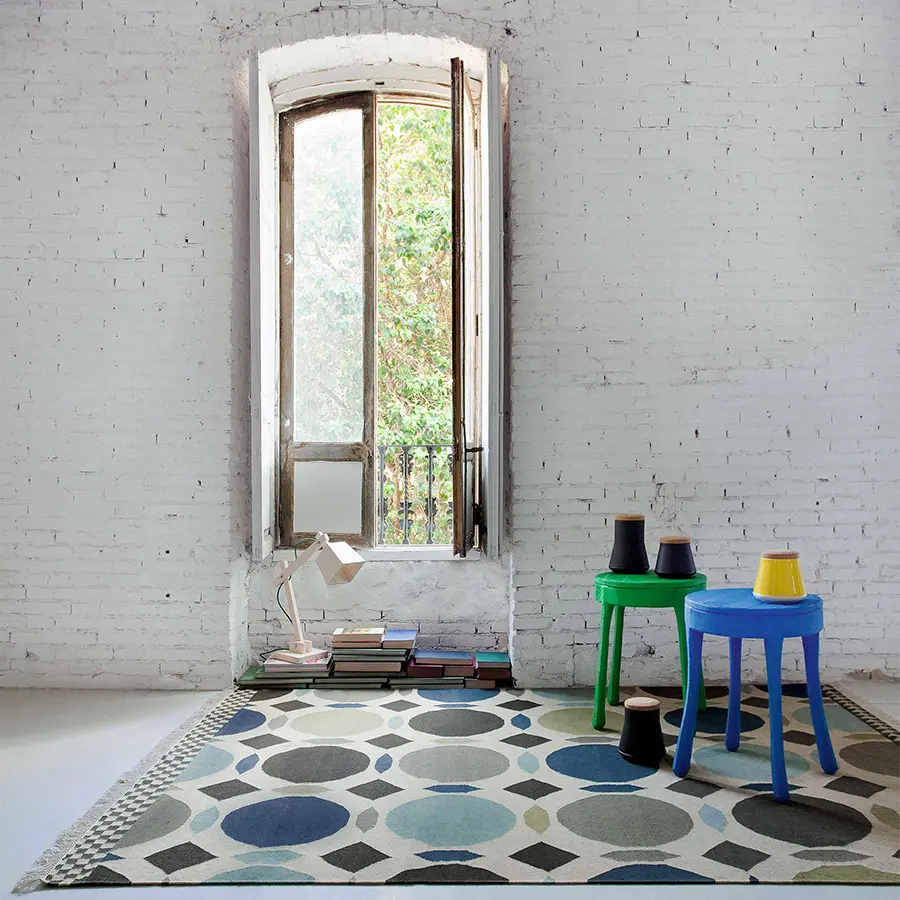 Esta es la alfombra Canadá de nuestra colección de kilims, un modelo con un cierto aire de los años setenta, tanto por su dibujo como por su paleta de color. Empleando círculos, hexágonos y rombos, la diseñadora Sandra Figuerola ha creado un motivo principal en el que estas tres formas geométricas van alternándose siguiendo un patrón, que recuerda a la gráfica de un pavimento o un papel pintado setentero.