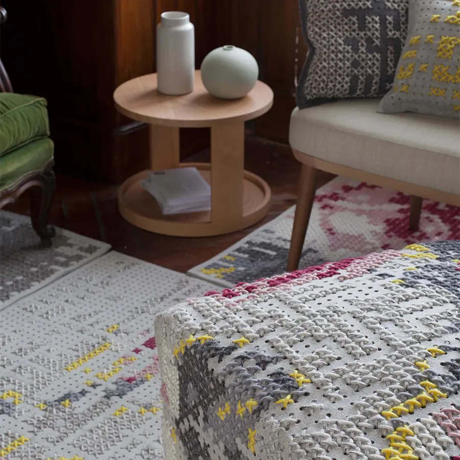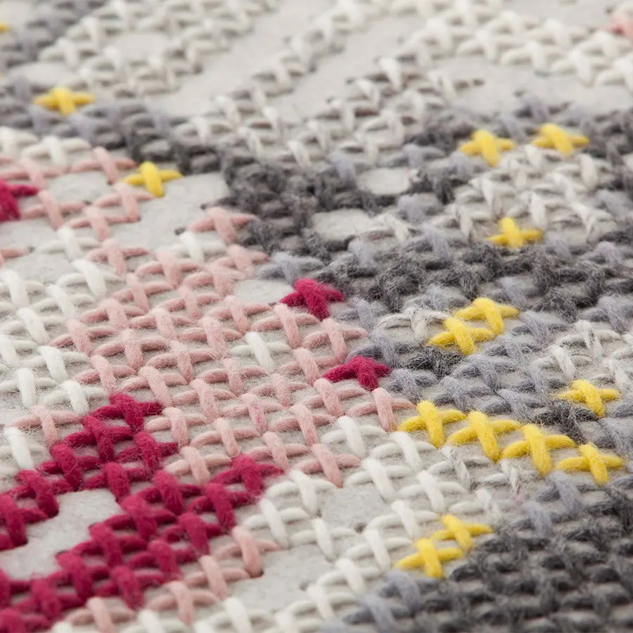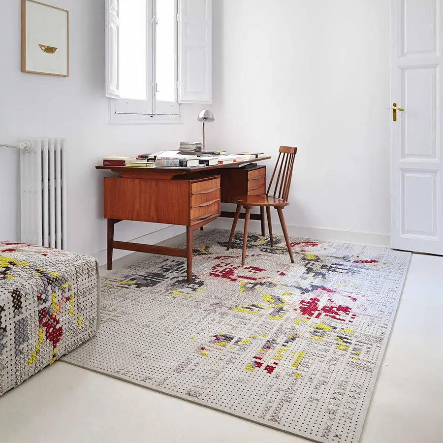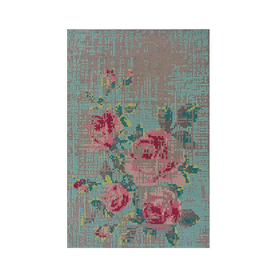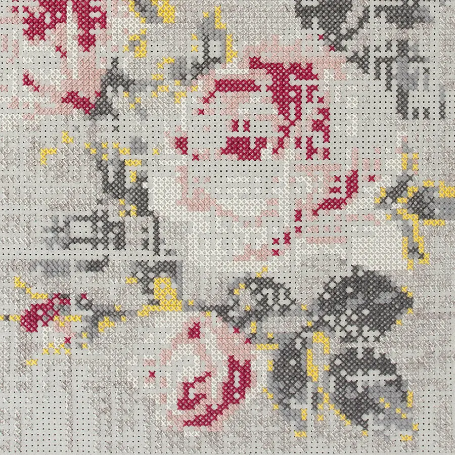 Esta es la alfombra modelo Flowers Natural de la colección Canevas. Está realizada a mano mediante una original adaptación de la técnica de punto de cruz en la que, sobre un tejido de fieltro, con hilos de lana se va trazando la apariencia de un desdibujado ramo de flores, a modo de imagen pixelada. En su elaboración se utilizan hilos de tonos suaves en color blanco, gris, rosa, rojo y amarillo. Es la versión de mayor formato y está disponible en dos tamaños.