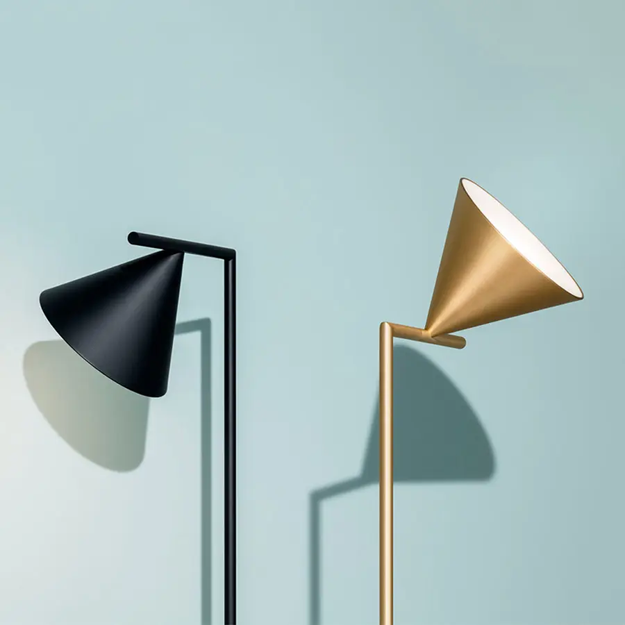 Dispositivo de iluminación de suelo con luz directa direccionable. Varilla y cono de acero lacado o latón cepillado. Difusor de policarbonato opalino fotograbado moldeado por inyección. Cable eléctrico con una longitud útil de 260 cm, con interruptor para regular la intensidad con pedal, que garantiza las funciones de encendido y apagado (ON/OFF) y la regulación del flujo luminoso 10-100 %. Suministro eléctrico en clavija con enchufes intercambiables.