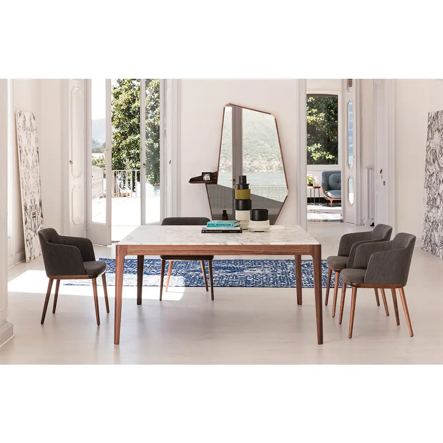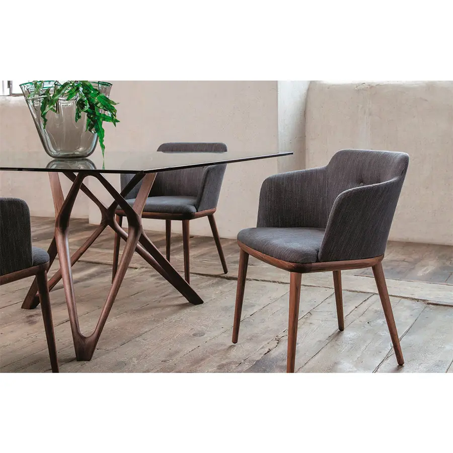 Silla con brazos y estructura en nogal canaletta o fresno macizo y revestimiento en las telas de la colección. Botones en la misma tela del asiento o en contraste.