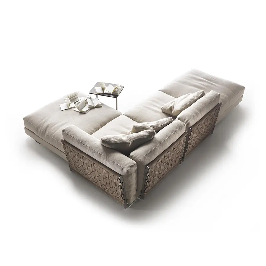 El sofá Cestone fue diseñado para una ubicación ideal en el centro de la sala de estar. Se enfatizan el respaldo y los lados del sofá, partes que a menudo no presentan características de particular valor. Por el contrario, en el sofá Cestone el respaldo y los laterales están formados por armazones metálicos recubiertos de cuero trenzado. Hay dos opciones para la trama irregular hecha con tiras de cuero en dos anchos. El trenzado puede ser más denso, formando así una superficie compacta, o menos compacto, y permitir así vislumbrar el tejido de las partes tapizadas.