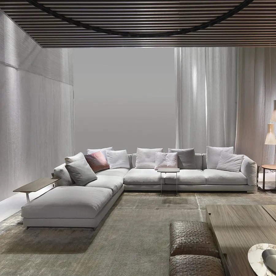 El sofá Cestone se puede completar con las mesas de centro del mismo nombre con tablero de nogal americano o de fresno en una amplia gama de colores, creando un fascinante contraste con la calidez de la piel.