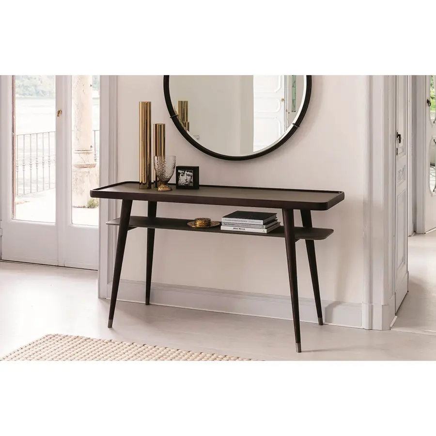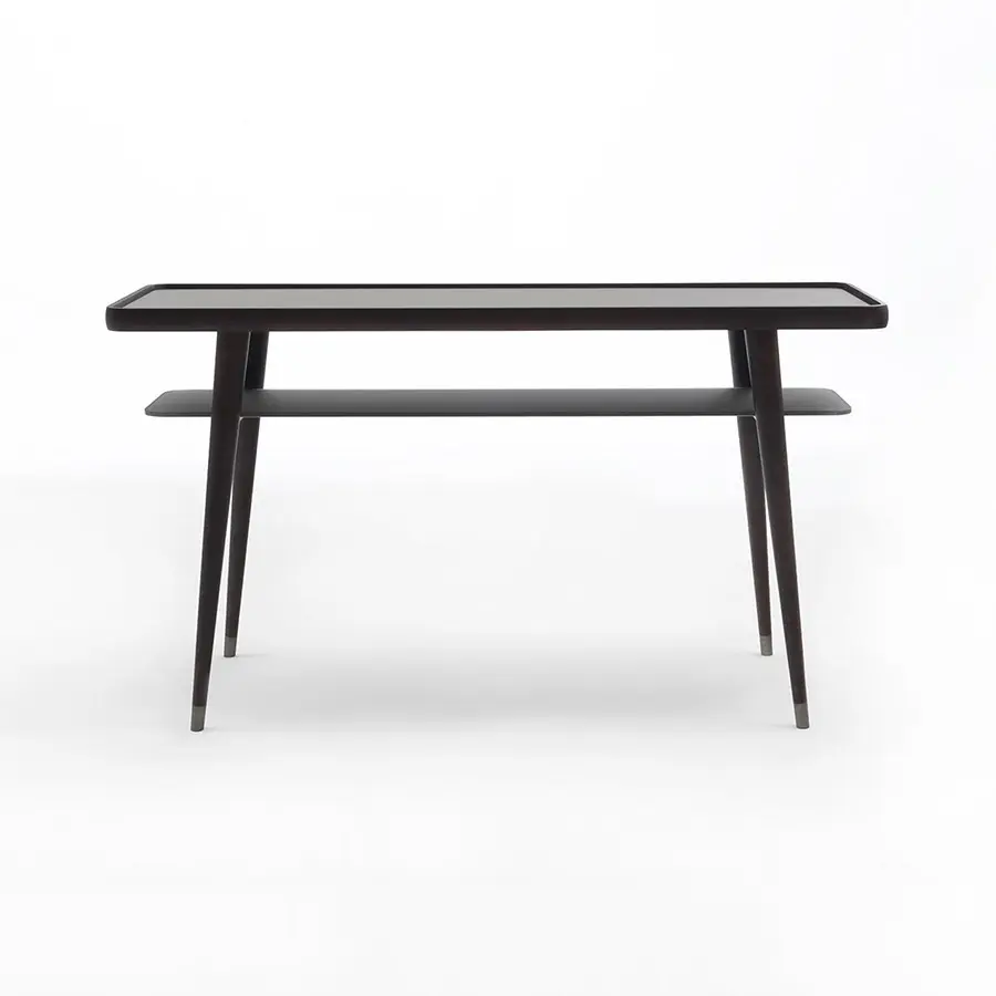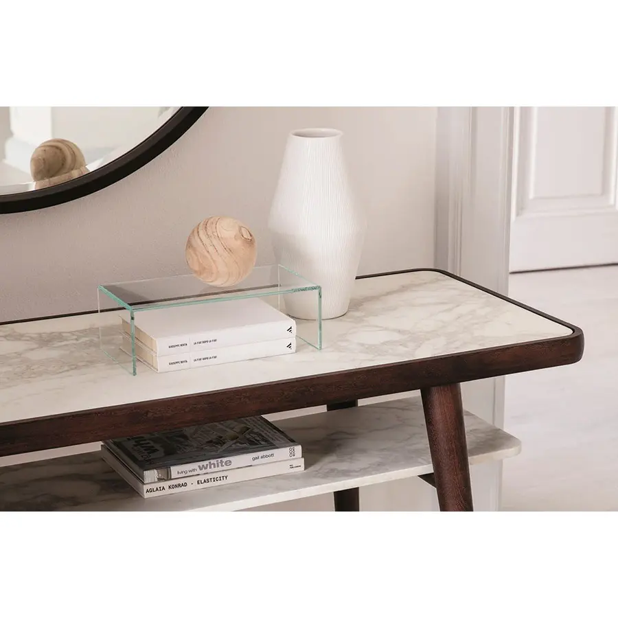 Consola en fresno macizo con repisas de cristal o de mármol. Pies en metal.