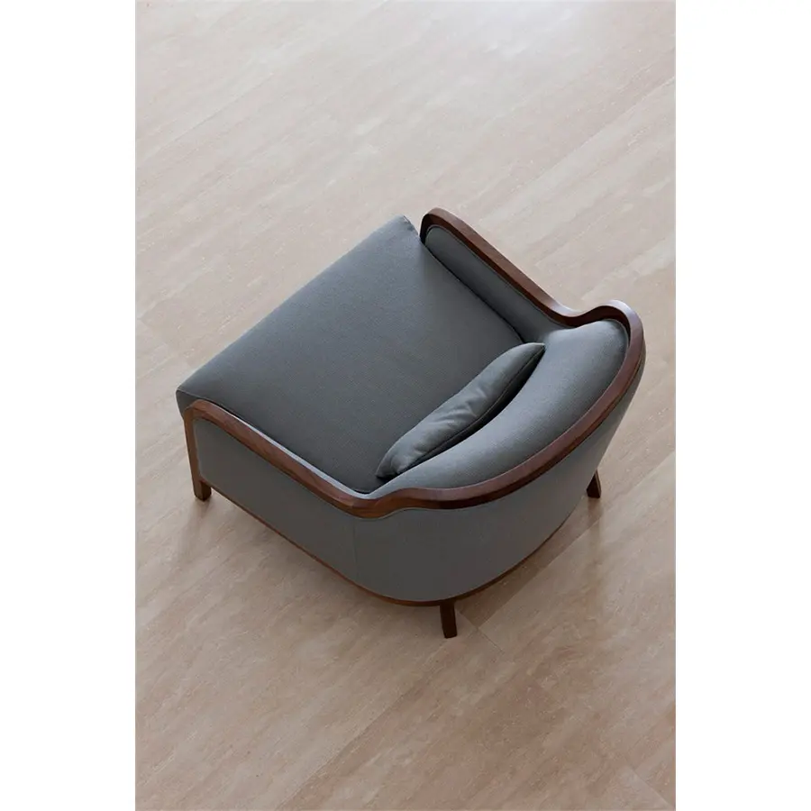 Butaca con estructura de nogal canaletta macizo, acolchadacon espuma de poliuretano de densidad variable, revestida con tela técnica protectiva. Revestimiento en las telas de la colección.