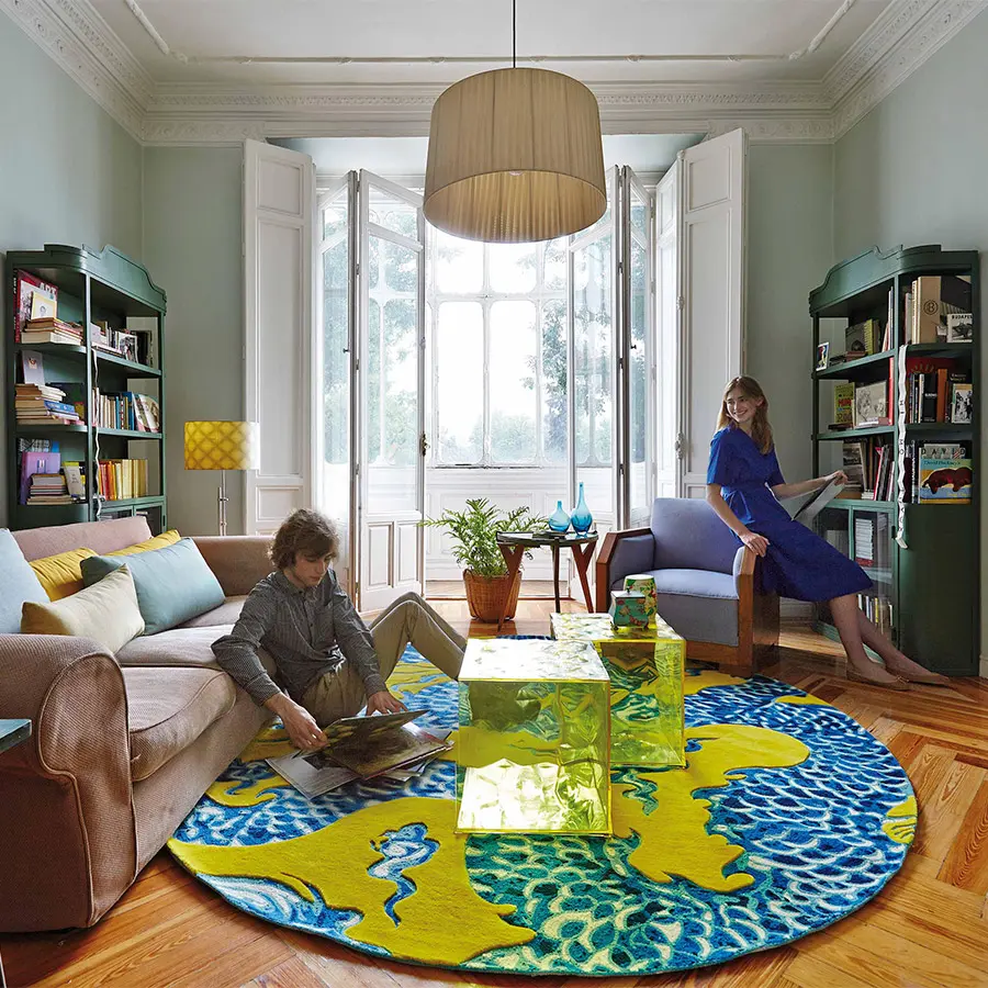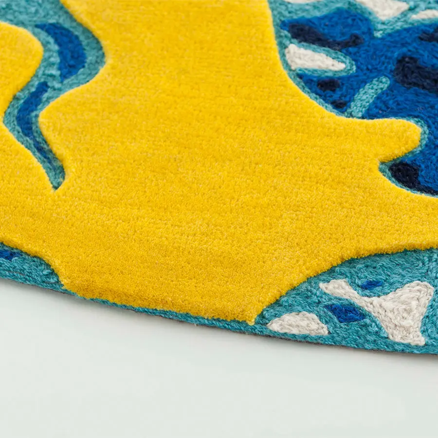 Con bordado de cadeneta se confeccionan las zonas de tonos azules y blancos, mientras que con hand tufted se elaboran las áreas de color amarillo. Es un diseño de nuestra directora creativa, Mapi Millet, con un formato redondo y de grandes dimensiones pues mide 2,5m de diámetro. Se realiza artesanalmente con 100% lana virgen y está disponible también en una versión de tonalidades solamente azules y blancas.