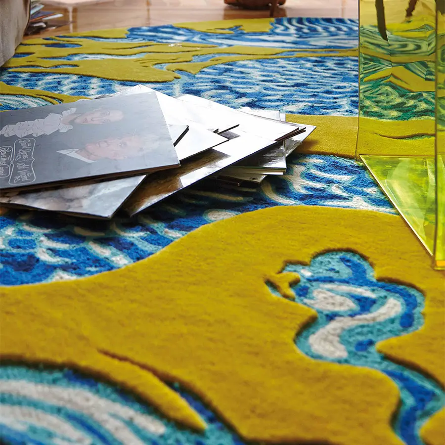 Modelo amarillo de nuestra alfombra Blue China, con un dibujo de diseño abstracto elaborado completamente a mano empleando dos técnicas de texturas muy diferentes. Por un lado, una innovadora versión del punto de cadeneta con una textura de bordado; por otro, una superficie más lisa y homogénea de mayor cuerpo, propia de la técnica hand tufted.