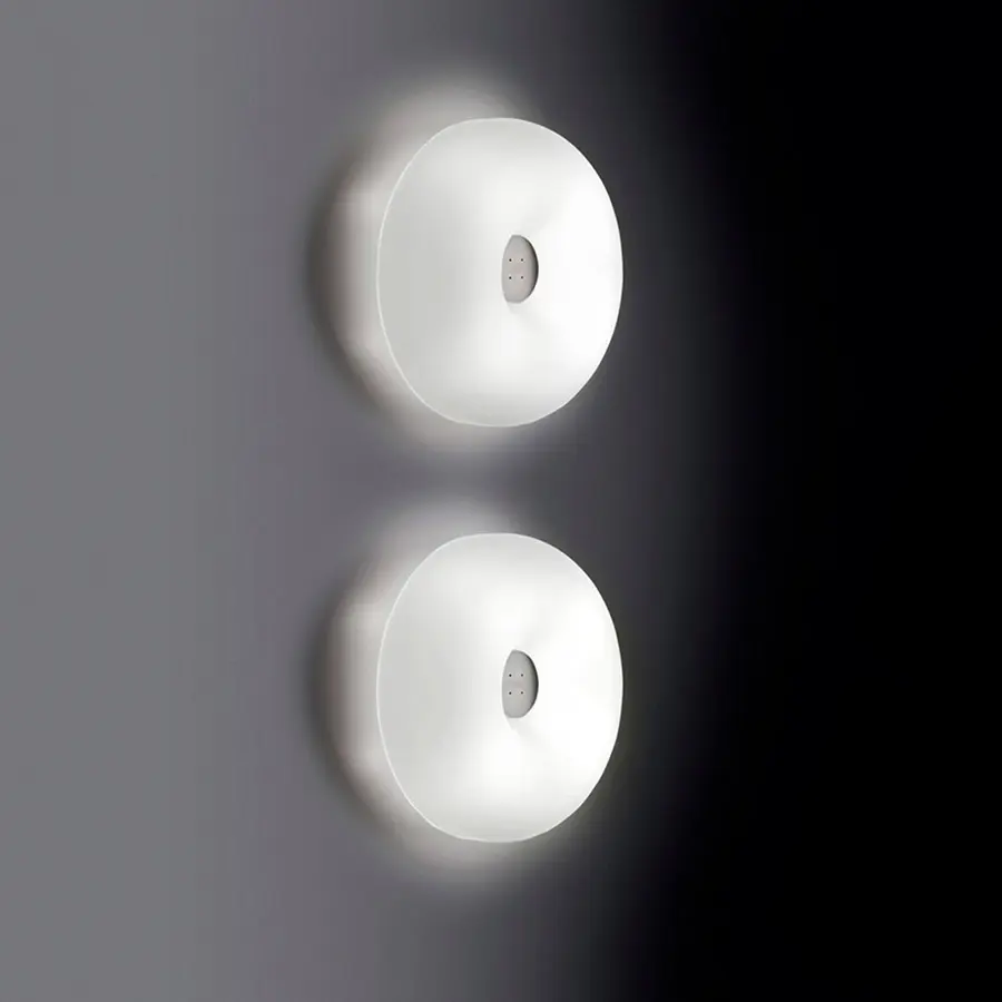 Un suave volumen en vidrio soplado parece fijado por un botón metálico satinado, elemento de identificación de Circus, colocado coincidiendo con el orificio central. El nombre evoca precisamente su perfil circular, una forma siempre actual, al punto de formar parte de la colección desde el 1994. Disponible como lámpara de pared o de techo, Circus amuebla con su estructura sencilla y equilibrada, acentuada por el resplandor intenso que se filtra por el difusor blanco. La superficie brillante enriquece su volumen esencial con un juego de elegantes reflejos. Se encuentra disponible en dos tamaños.