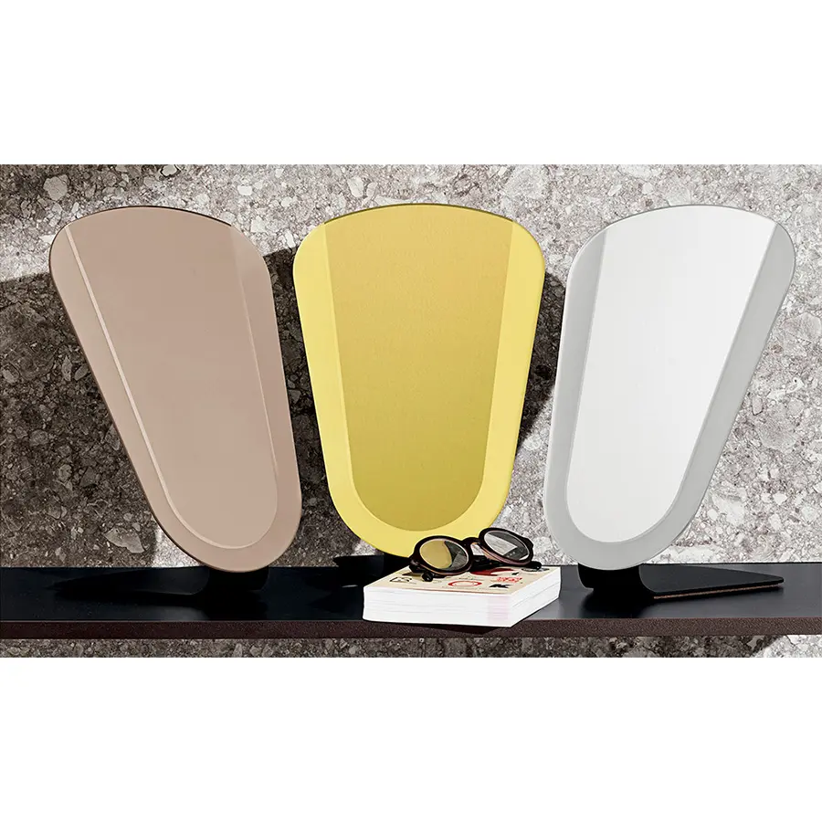 El espejo Clessidra, con sus líneas suaves y su marco lijado, se puede colocar con diferentes orientaciones. Asume una nueva característica funcional sobre la mesa y en sus versiones independientes.